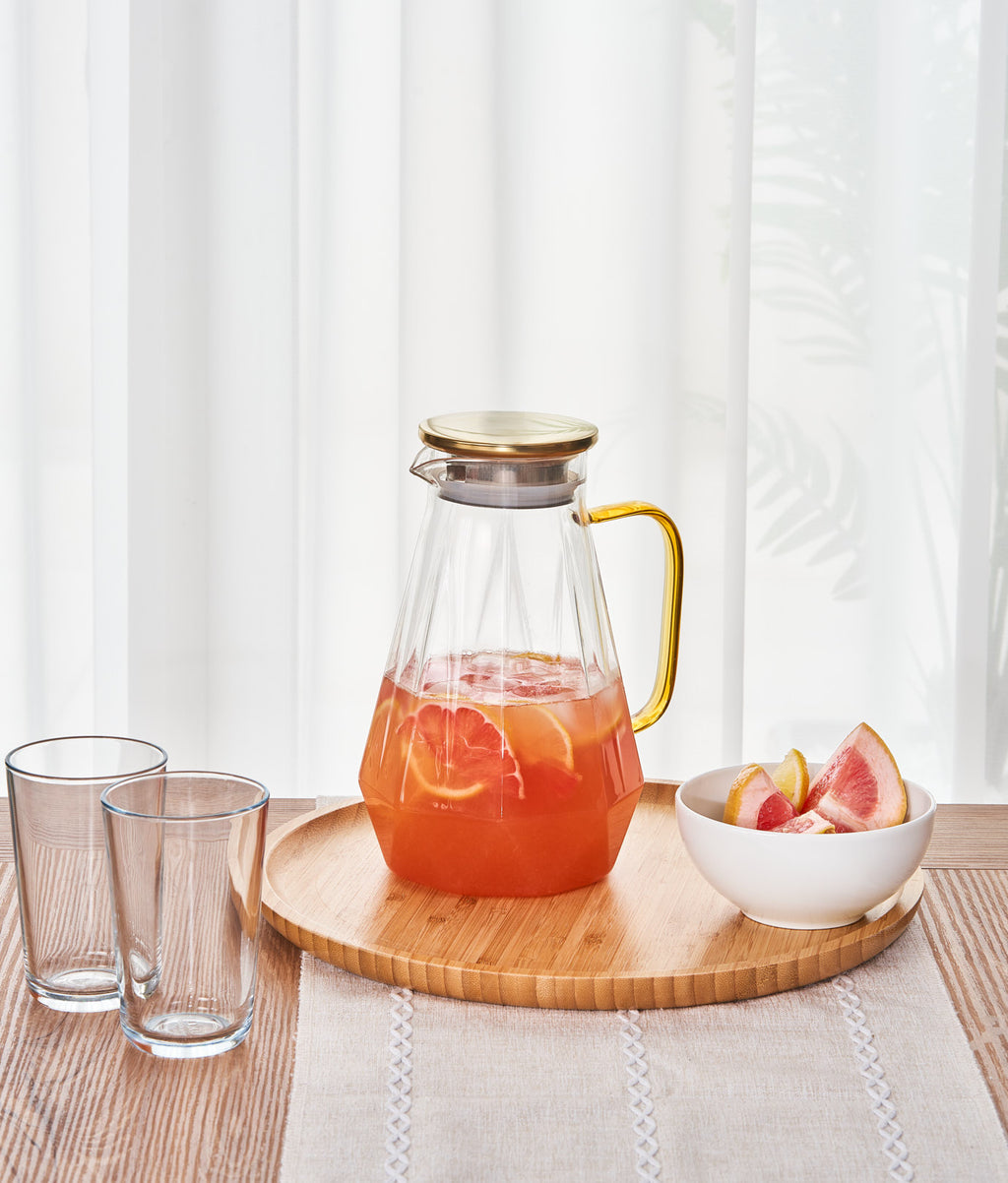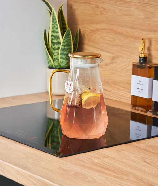 Ideală pentru servirea elegantă a băuturilor, fără compromisuri. Fie că e vorba de apă infuzată, ceaiuri calde sau limonade răcoritoare, această carafă le face pe toate cu stil. O poți așeza direct pe plită, o poți spăla la mașină și arată impecabil la fiecare utilizare. Gata cu recipientele banale care nu țin pasul cu nevoile tale zilnice. Designul în formă de diamant, detaliile aurii și capacul inteligent îți transformă fiecare servire într-un gest rafinat și practic. E soluția perfectă pentru cei care vor ceva frumos, util și de durată.