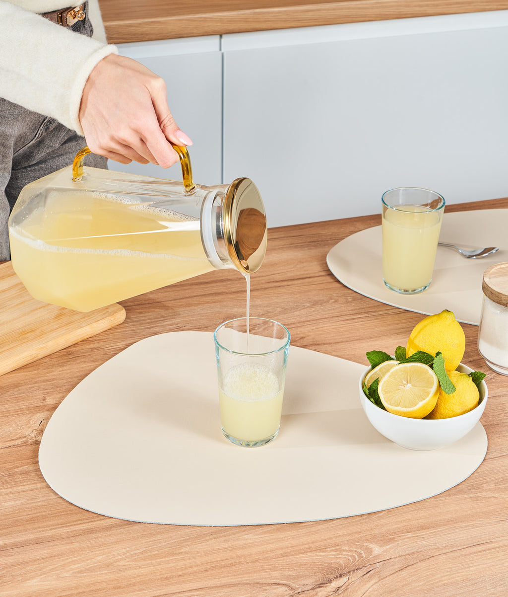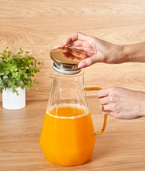 Capacul din inox vine cu două opțiuni de turnare: una largă și una cu filtru fin care reține frunzele de ceai sau bucățile de fructe. Ai control total asupra fiecărei serviri. Gura antipicurare elimină stropii, iar deschiderea largă îți permite să cureți carafa fără efort. Garnitura de fixare păstrează capacul în poziție chiar și când o înclini complet.