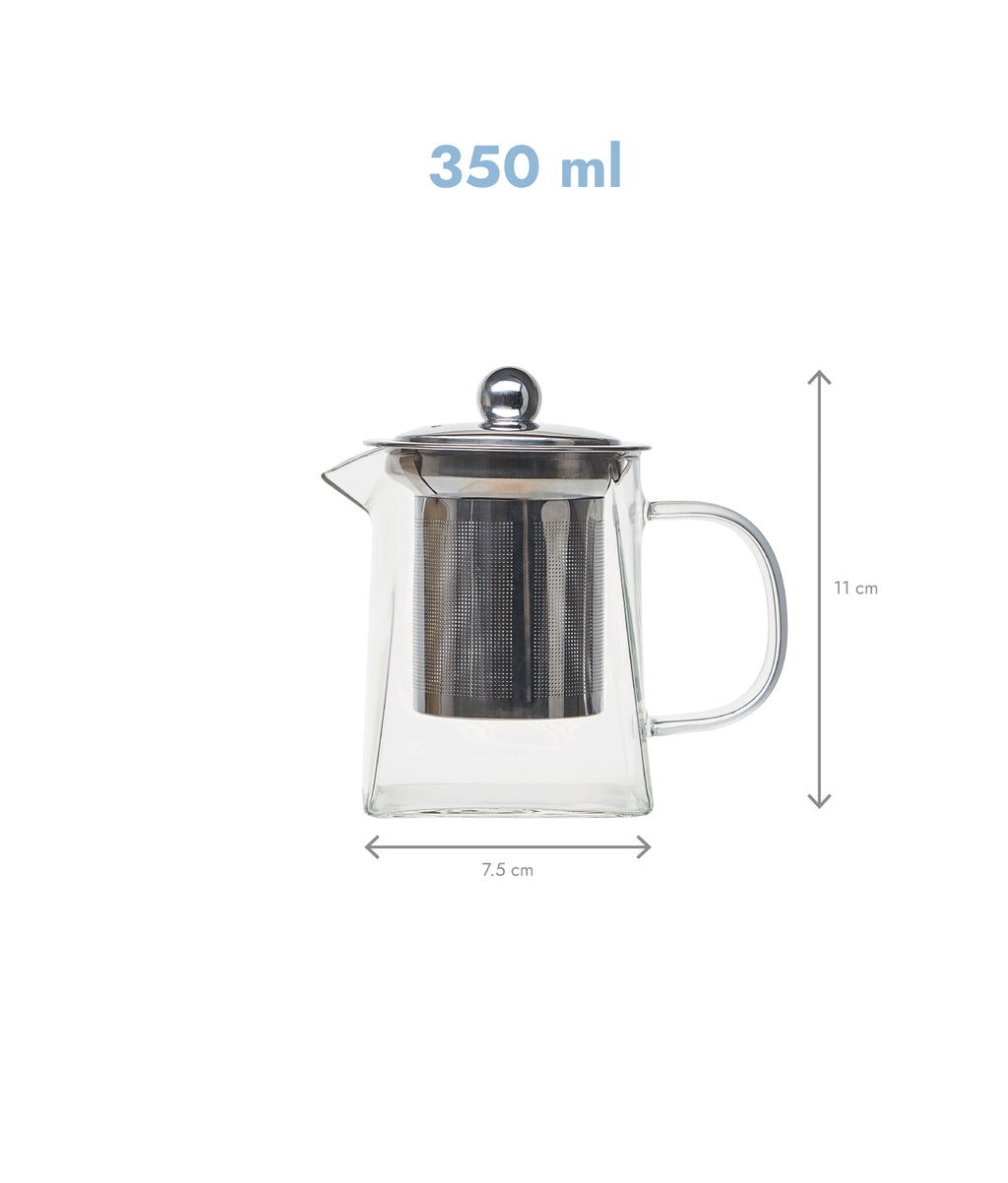 Ceainic compact din sticlă borosilicată, cu o capacitate de 350 ml. Dimensiuni: 7.5 x 7.5 x 11 cm. Include filtru fin și detașabil din oțel inoxidabil. Capacul poate fi folosit ca suport pentru filtru. Potrivit pentru o singură porție de ceai. Poate fi folosit direct pe plită. Fără BPA, nu reține mirosuri sau arome. Compatibil cu mașina de spălat vase.