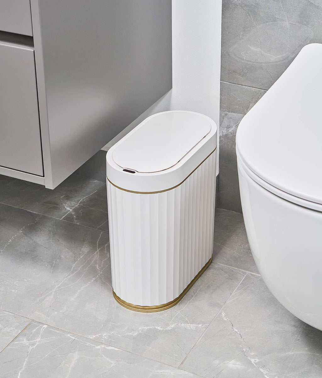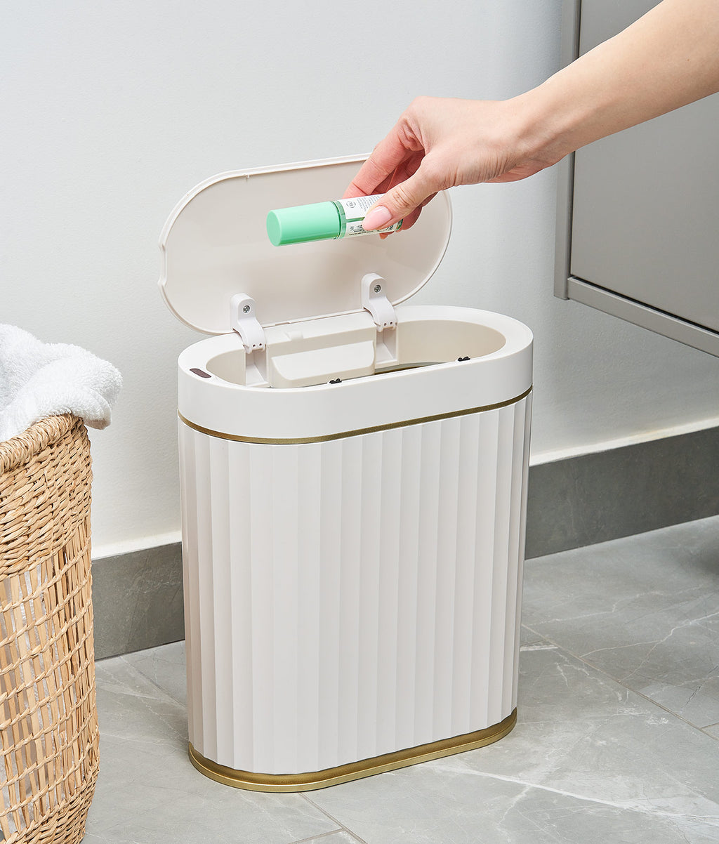 Coș de gunoi automat cu senzor de mișcare. Volum de 7L, ideal și pentru băi mici sau medii. Fabricat din plastic rezistent, cu finisaj neted ușor de curățat. Funcționează cu 2 baterii AA, autonomie de până la 12 luni. Dotat cu capac etanș, senzor de proximitate ultra-rapid (0.3 secunde), sistem silențios de închidere și cadru interior pentru fixarea și mascarea sacului de gunoi. Bază antiderapantă și protecție IPX5 împotriva apei. Bateriile nu sunt incluse.