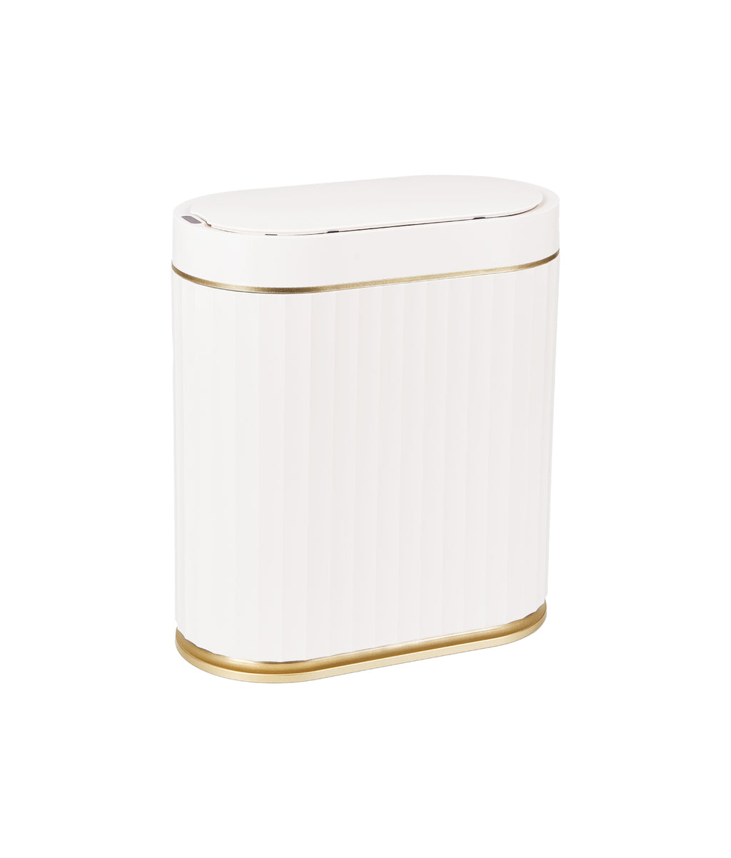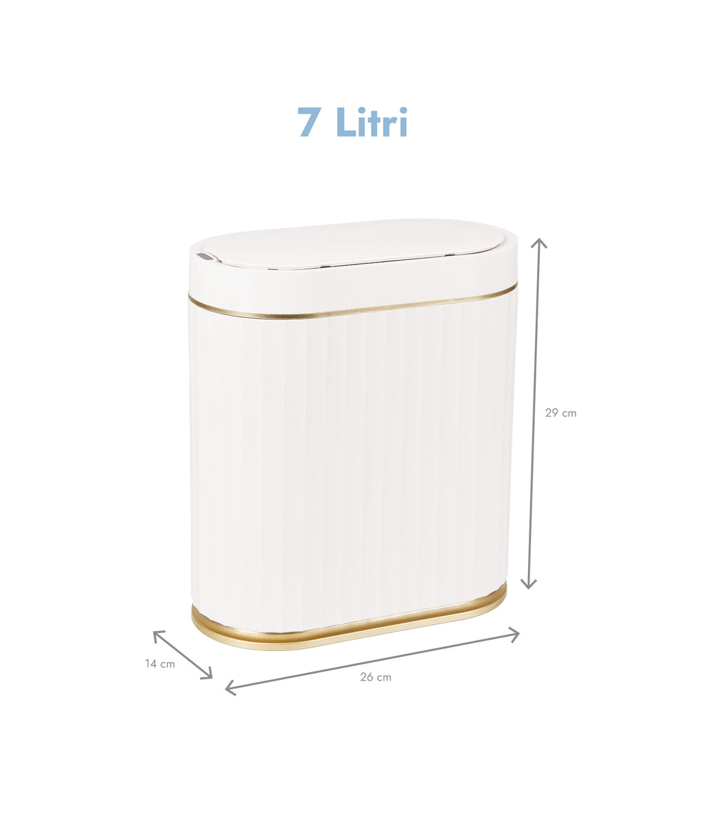Are un volum compact de 7 litri – suficient pentru utilizare zilnică în băi mici sau medii. Suprafața netedă se curăță ușor cu o lavetă umedă. Designul vertical economisește spațiu și aduce un plus de eleganță. Liniile fine și combinația de alb cu accente aurii transformă un obiect banal într-un detaliu de decor.