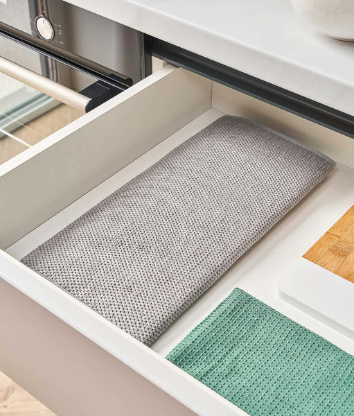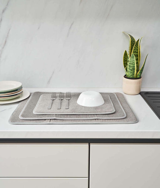 Covorașul de uscare din microfibră e soluția perfectă pentru uscarea rapidă a vaselor. E disponibil în 3 dimensiuni și în culoarea gri. Materialul de înaltă calitate absoarbe de până la 4 ori greutatea sa în apă. E ușor de utilizat și de depozitat. Protejează blatul de umezeală și se curăța simplu manual. Covorașul se spală și în mașina de spălat la program scurt, la 30 de grade. Fără înălbitor sau alte substanțe chimice agresive.