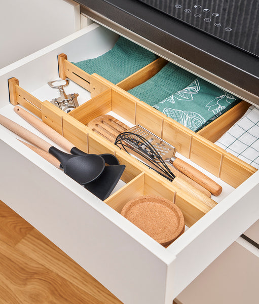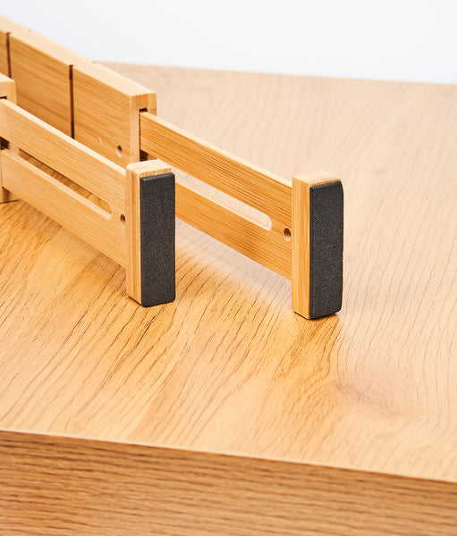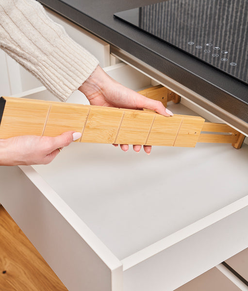 Organizatoarele pentru sertar din bambus sunt disponibile într-un set ce conține 4 separatoare reglabile și 6 inserții. Separatorul principal are dimensiunile între 43-56.5 x 6 cm, cu o grosime de 1.5 cm. Cele 4 inserții mici măsoară 12.7 x 6 cm fiecare, iar cele 2 mari au dimensiunile de 17.8 x 6 cm. Realizate din bambus rezistent și sunt echipate cu protecție de silicon la ambele capete. Fixarea stabilă e asigurată de arcurile puternice.