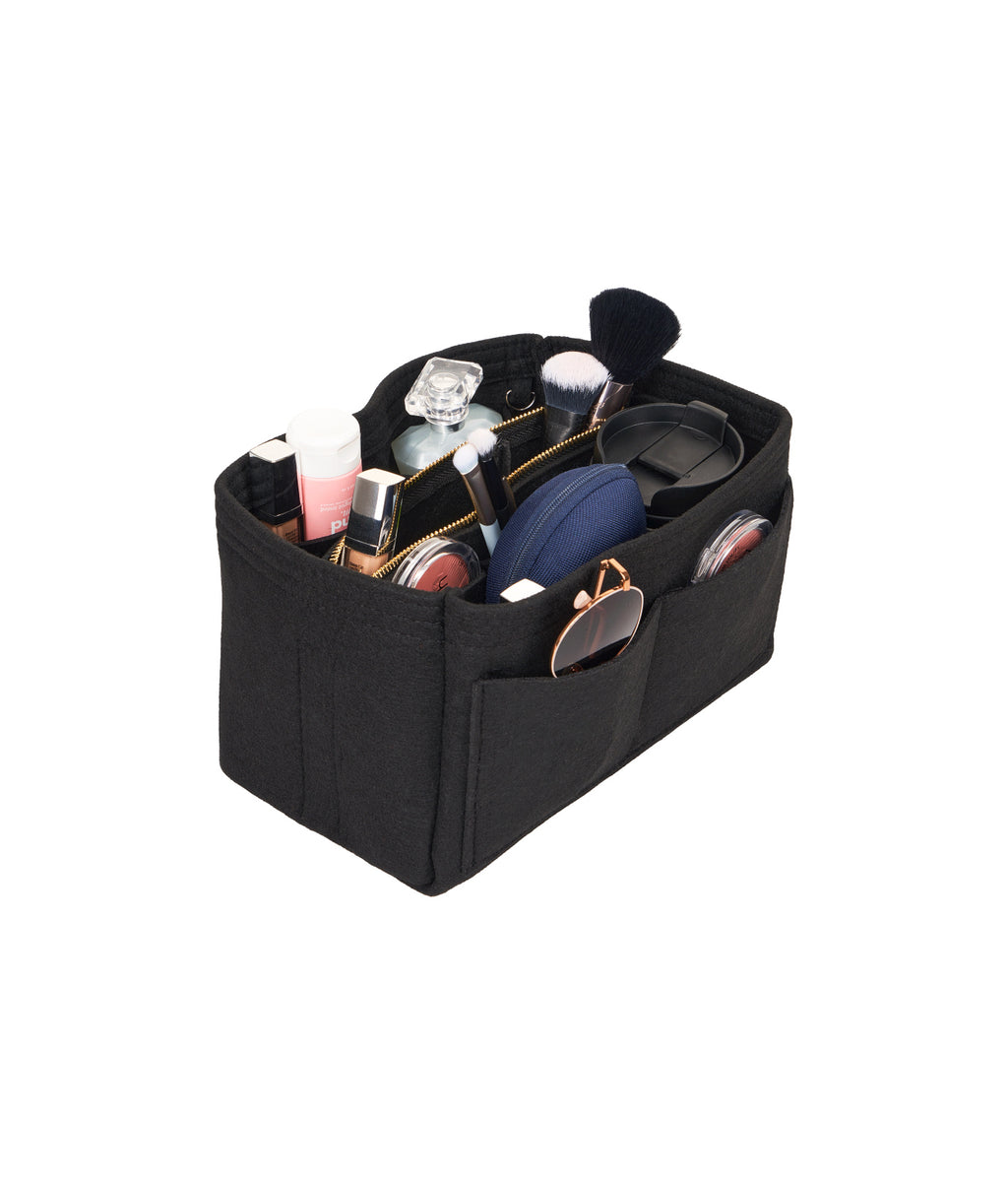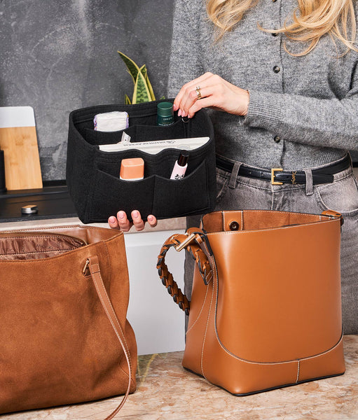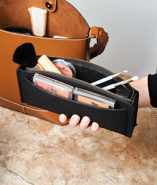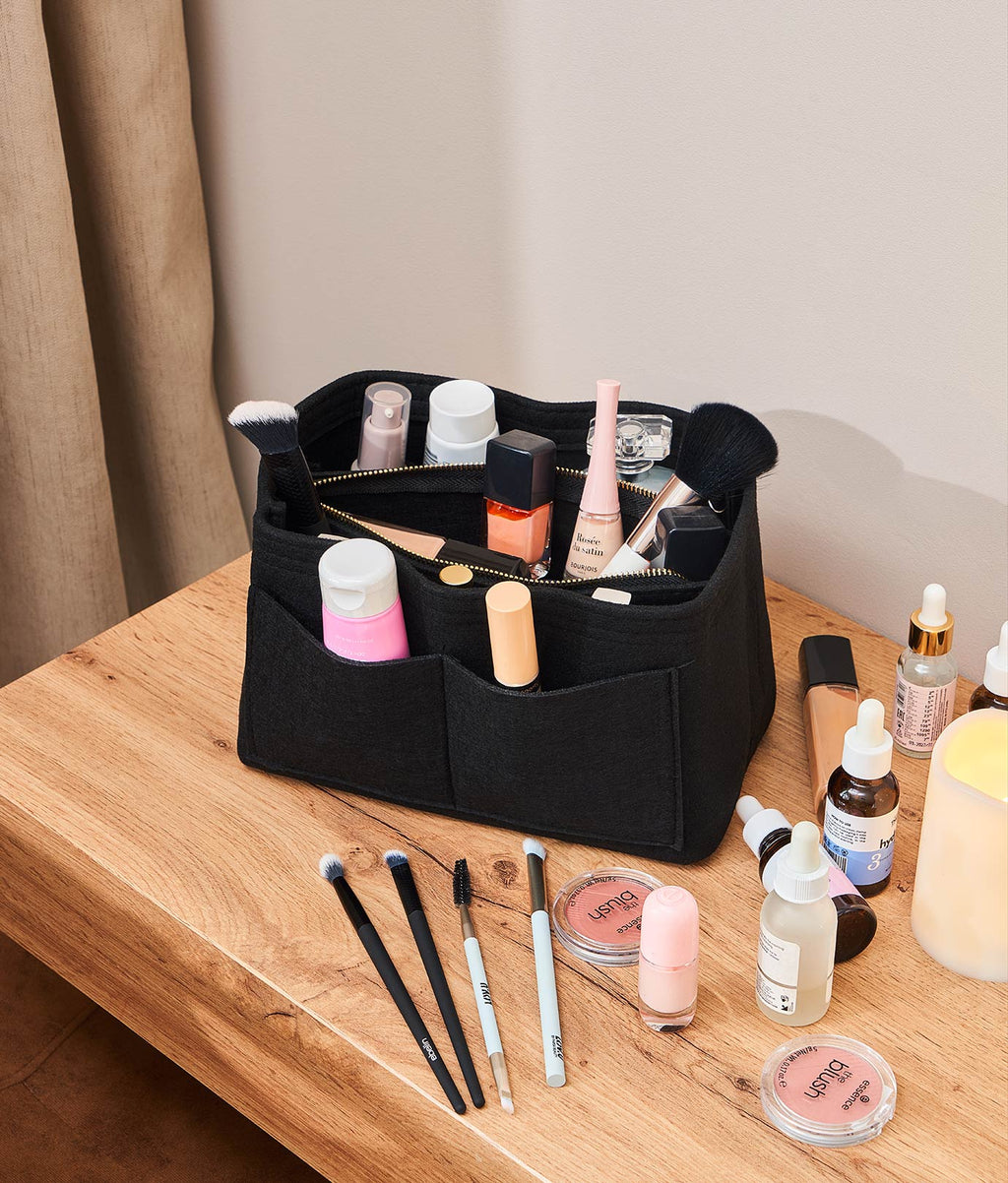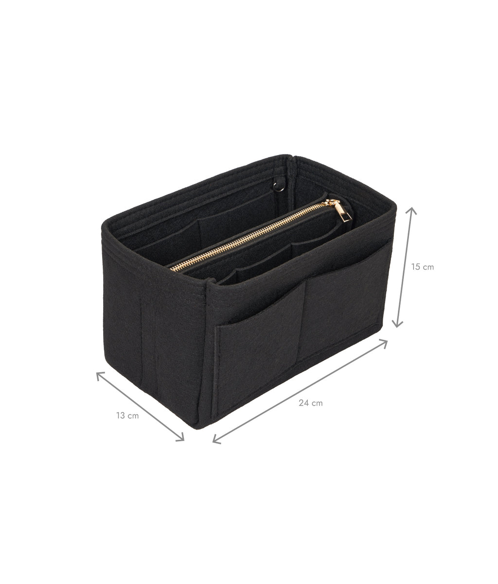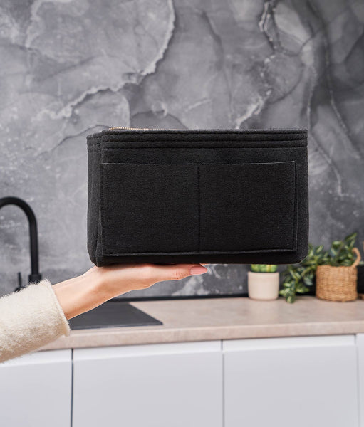 Organizator de geantă cu dimensiunile 24 x 13 x 15 cm. Fabricat din material de pâslă (fetru), moale și rezistent. Include 15 buzunare de diferite dimensiuni și un portfard central detașabil cu fermoar. Greutate redusă (~200g), fără BPA. Structură stabilă, potrivit pentru geanta de zi cu zi, rucsacuri sau bagaje de mână.