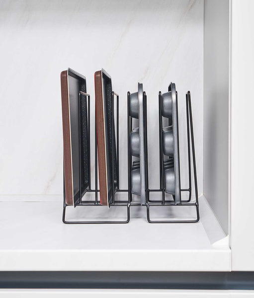 Organizatorul e ideal pentru depozitarea tăvilor, tocătoarelor și altor ustensile mari. Menține totul la îndemână și protejează tăvile de zgârieturi. Oferă mai mult spațiu disponibil în bucătărie.