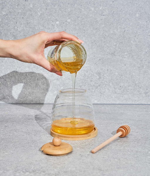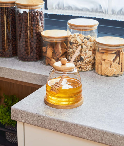 Designul său natural, cu capac și tavă din bambus, completează perfect recipientele din aceeași colecție. Tava din bambus protejează suprafețele, previne murdăria și menține blatul curat. Sticla transparentă permite verificarea rapidă a cantității de miere rămase. Materialele durabile asigură o utilizare îndelungată. Dacă mierea se cristalizează, poate fi încălzită direct în recipient, fiind sigur pentru utilizare în cuptorul cu microunde.