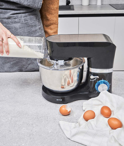 Bolul încăpător de 5.5L din inox îți permite să prepari până la 2 kg de aluat într-o singură utilizare. E perfect pentru mese generoase în familie sau prăjituri de sărbători care aduc bucurie. Accesoriile incluse sunt proiectate pentru fiecare tip de preparat. Telul din inox creează frișcă aerată și spume pufoase. Cârligul frământă aluaturi dense fără efort. Iar paleta cu lamele din silicon mixează cremele până la o textură fină, gata să încânte gusturile tuturor. Designul elegant din inox și plastic premium adaugă un plus de stil bucătăriei tale și te asigură că vei folosi acest aparat cu plăcere mulți ani.