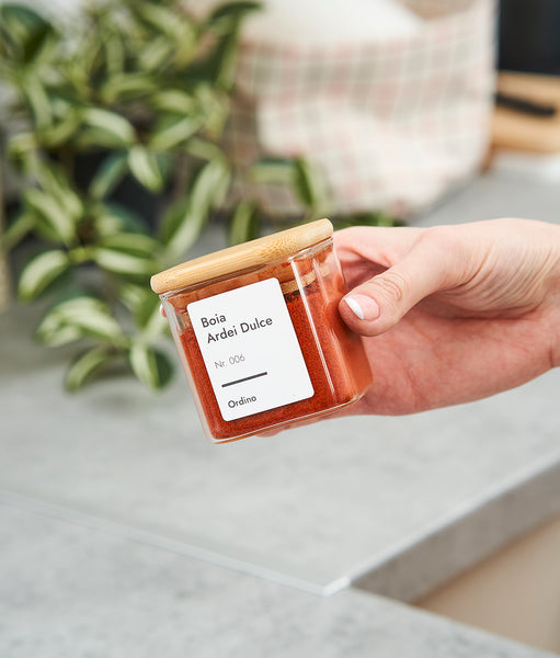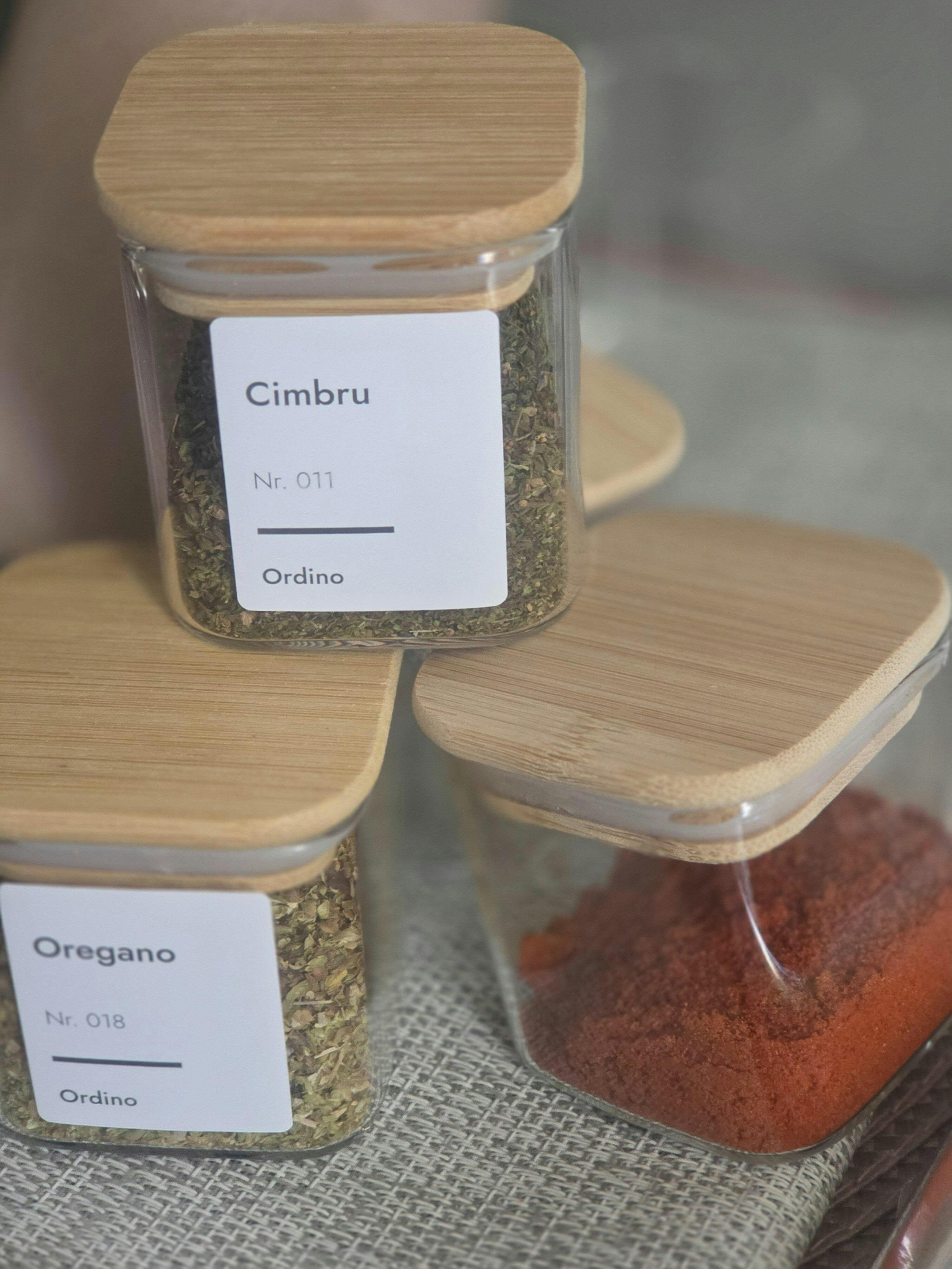 Setul modern pentru organizarea condimentelor conține 12 recipiente din sticlă de 175 ml. Dimensiunea lor e de 6 x 6 x 6 cm și au forma pătrată. În acest set vei găsi 12 capace etanșe de bambus. Primești 2 tipuri de autocolante albe rezistente la apă. Una imprimată în limba română și una goală, pe care o poți personaliza cu ajutorul markerului inclus. Iar cu ajutorul linguriței din bambus, măsurarea și folosirea condimentelor devin o experiență simplă și precisă.