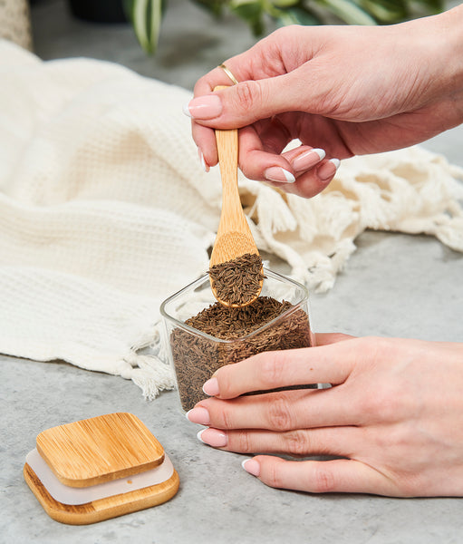 Capacul din bambus cu garnitura de silicon închide perfect recipientul. Aerul și umiditatea nu afectează condimentele. Acestea rămâne proaspete pe termen lung. Fără să-și modifice aroma și textura.