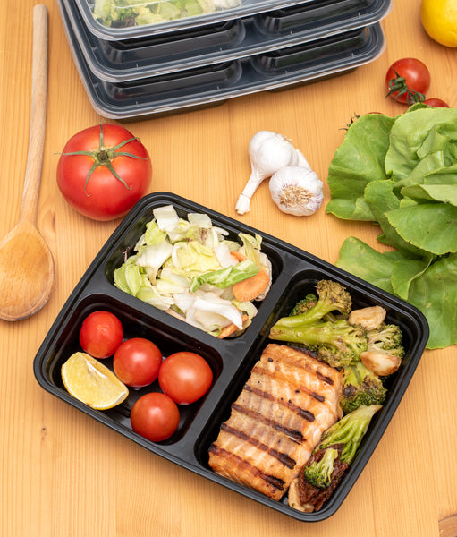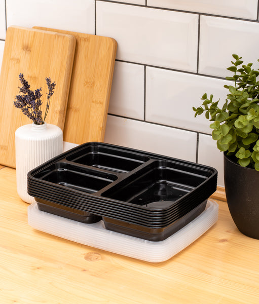 Recipientele reutilizabile pentru pregătirea meselor au dimensiunea 25,5 x 20 x 5 cm. Sunt împărțite pe 3 compartimente delimitate. Iar materialul rezistent le face durabile. Se pot pune în mașina de spălat vase și în cuptorul cu microunde. Sunt etajabile și se pot păstra și în congelator. Fiecare recipient are și un capac propriu, care se fixează bine și ușor.