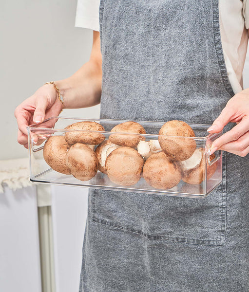 Cutii frigider cu sertar, dimensiuni 34 x 12.6 x 11 cm, realizate din plastic transparent rezistent, fără BPA. Sistemul etajabil și sertarele glisante permit acces rapid la produsele din interior. Designul neted, cu colțuri rotunjite, oferă siguranță și facilitează curățarea.