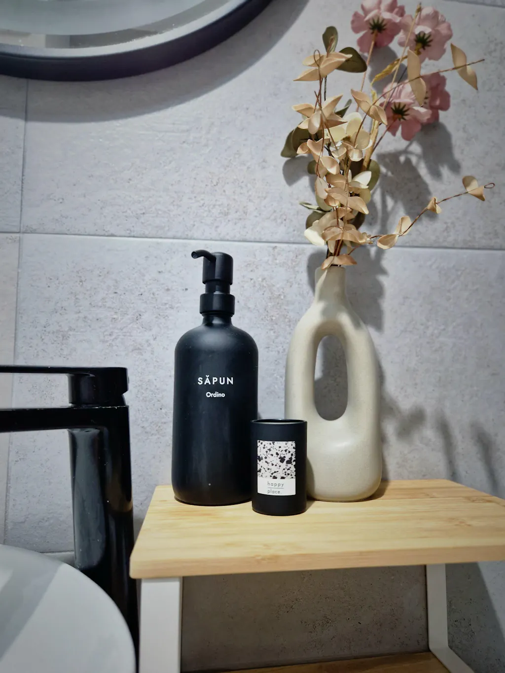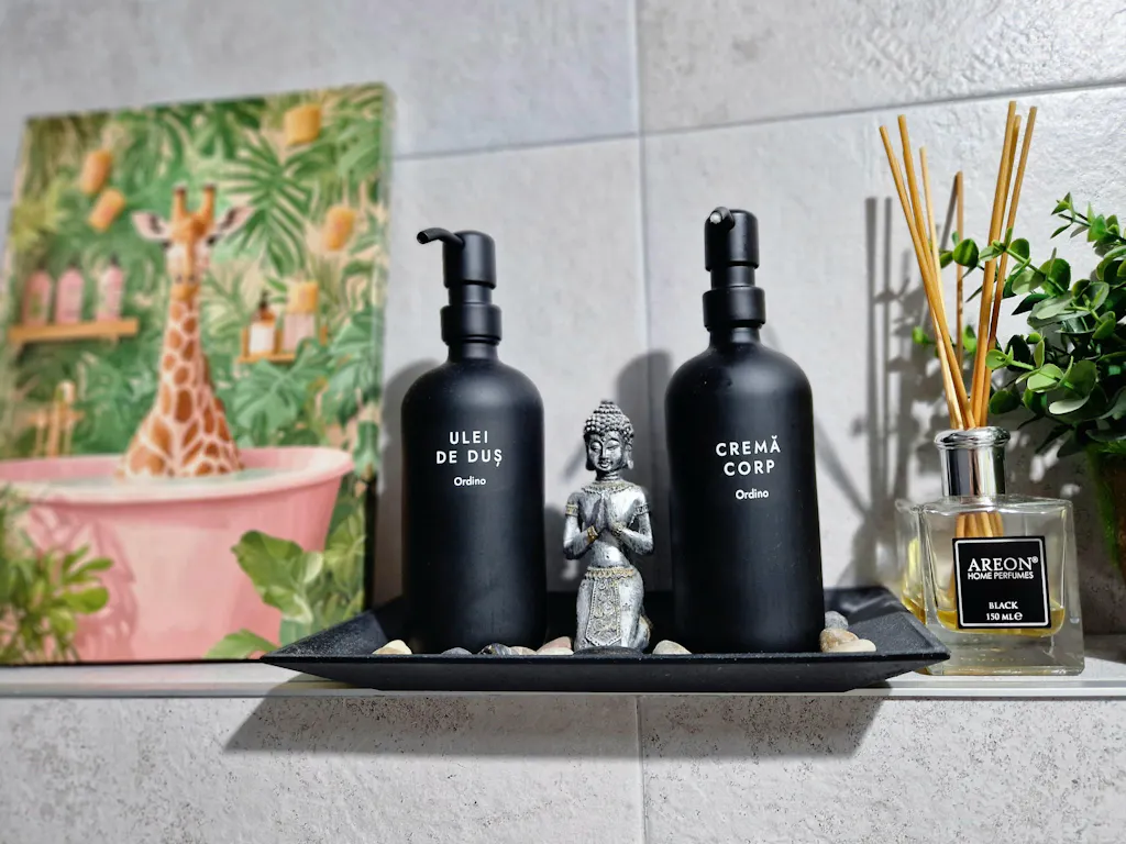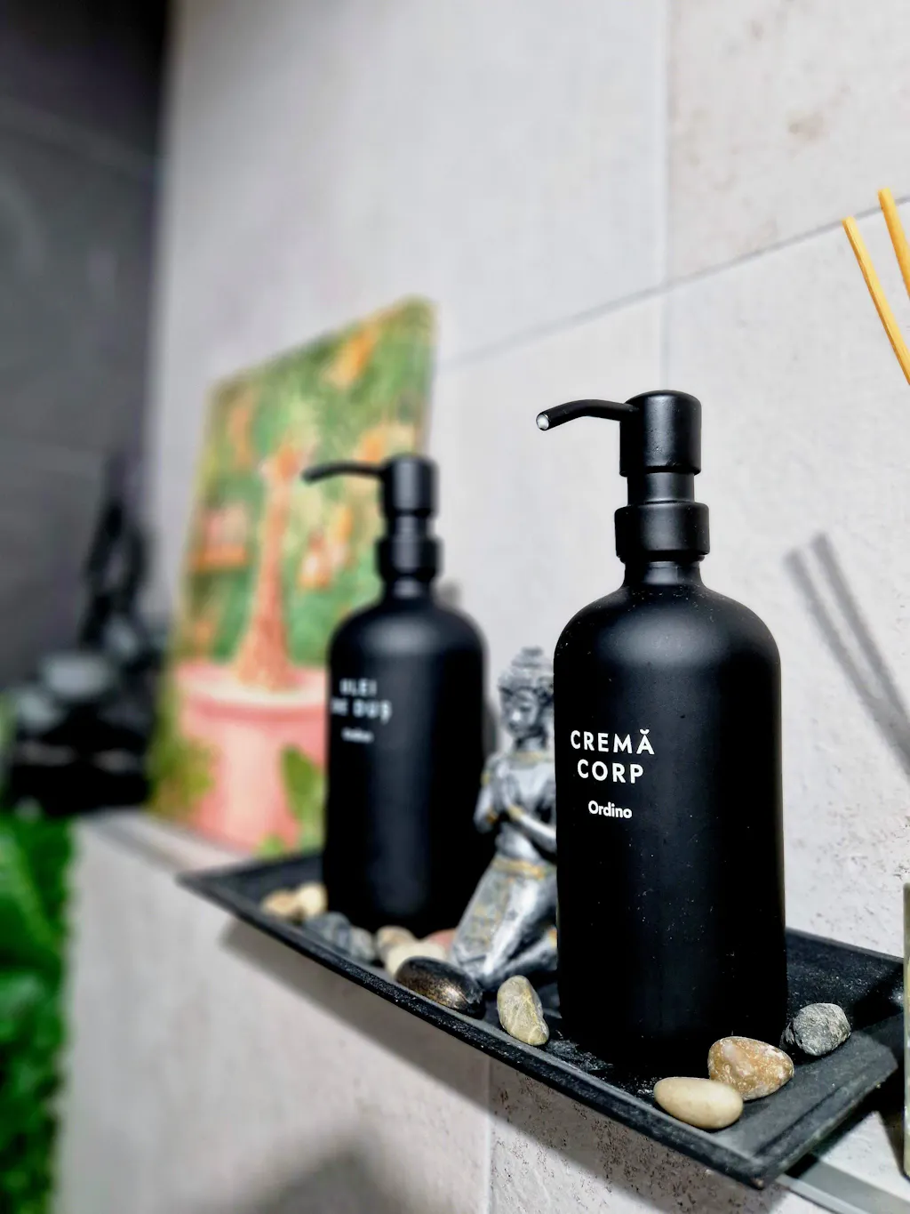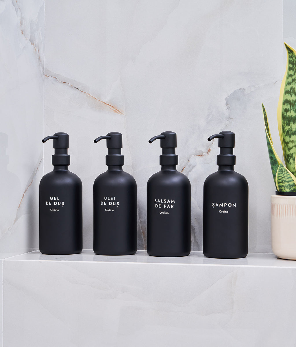 Ideale pentru o baie care arată bine, fără compromisuri. Transformă-ți baia într-un colț elegant, aerisit și coerent. Dozatoarele din sticlă mată adaugă un aer premium. Păstrează toată funcționalitatea de care ai nevoie zi de zi. Fie că e vorba de săpun, gel de duș sau șampon, totul e organizat, ușor de folosit și perfect încadrat în decor. Estetic și practic? Se poate.