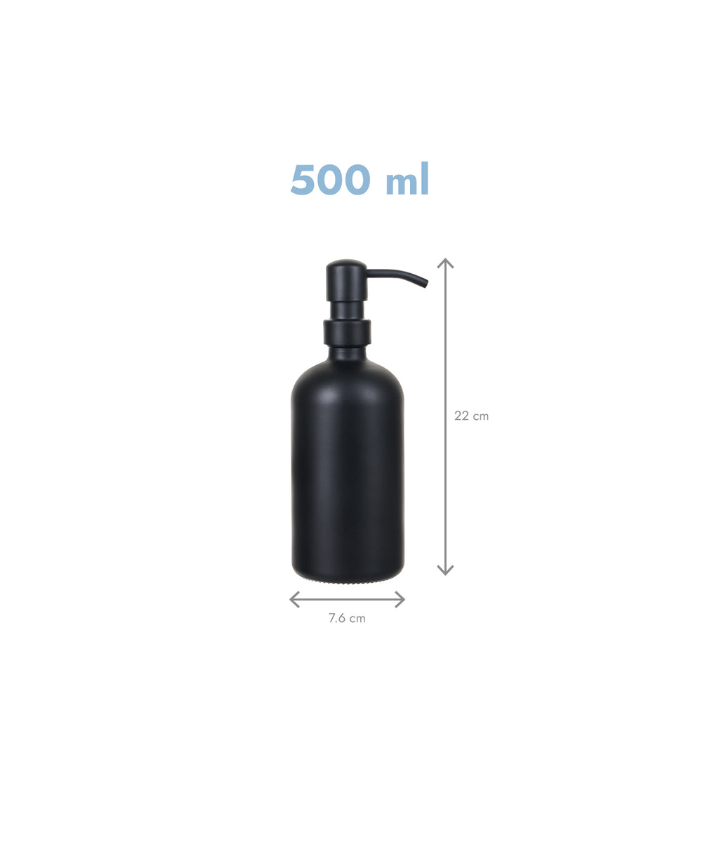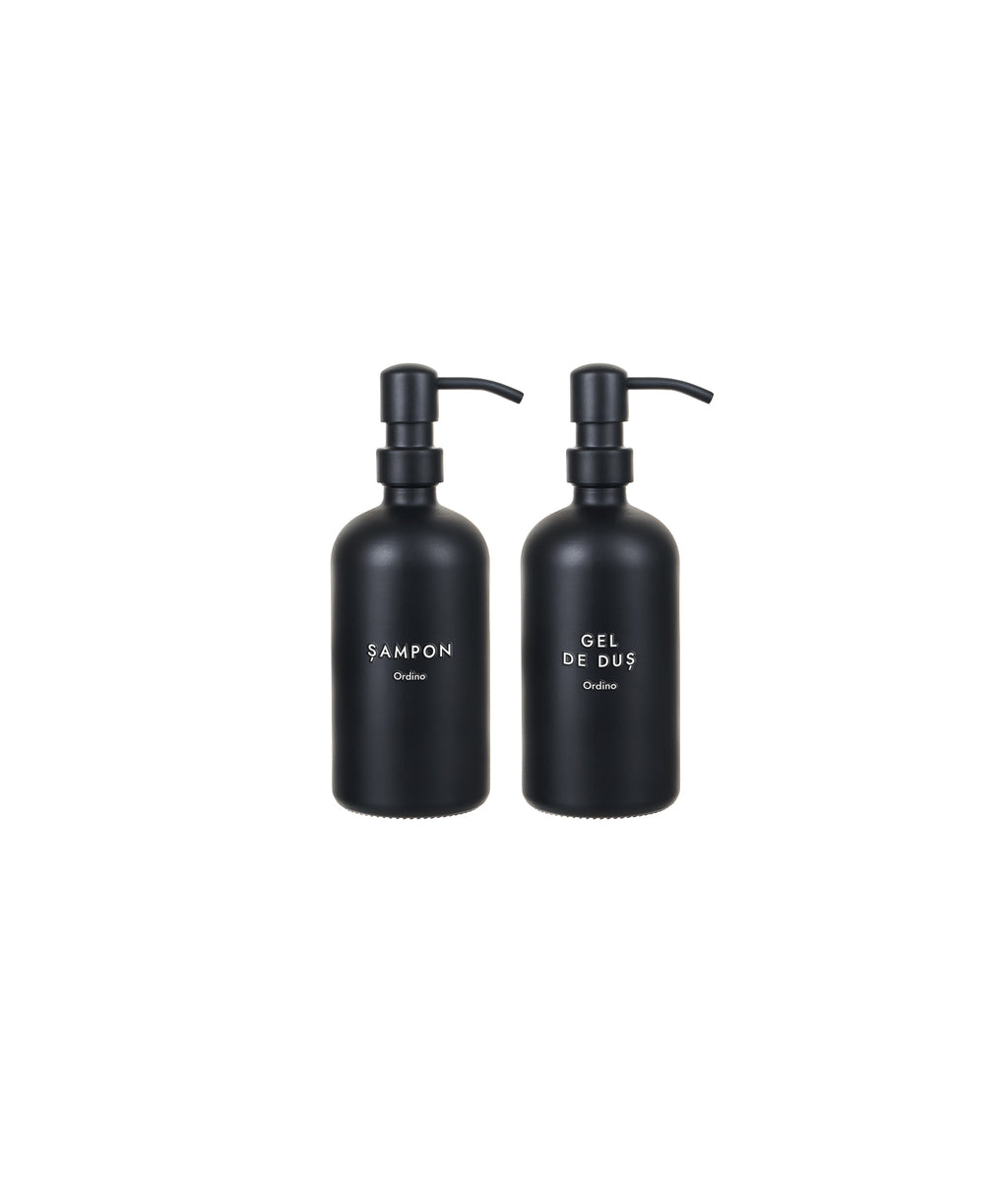 Set de 2 dozatoare din sticlă, finisaj mat, cu capacitate de 500 ml. Fiecare recipient e realizat din sticlă vopsită electrostatic (durabilă și rezistentă la șocuri), cu o pompă neagră din oțel inoxidabil, pentru un aspect elegant și modern. Închidere etanșă, fără BPA. Fiecare set include pâlnie pentru umplere ușoară și etichete transparente cu scris alb.