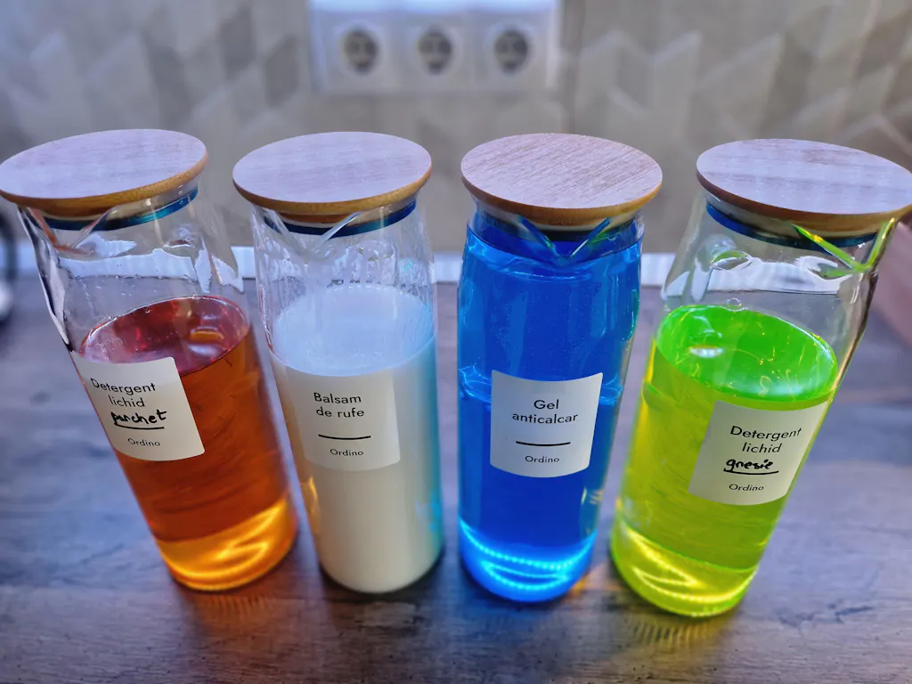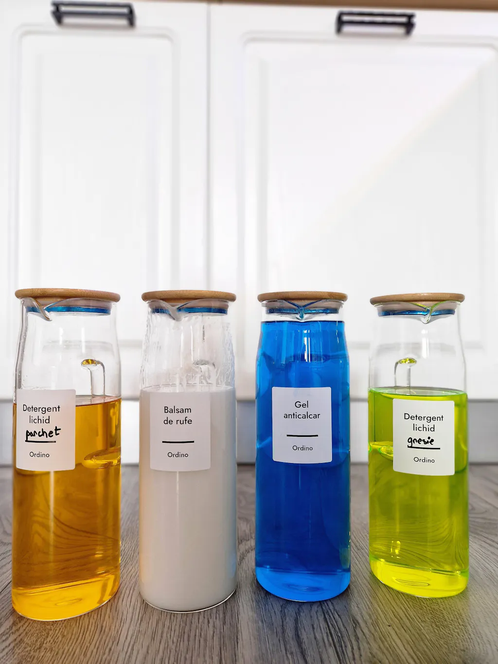 Primești etichete și marker pentru a scrie clar conținutul fiecărui recipient. Știi mereu ce folosești și aduci un strop de creativitate în spațiul de spălare.