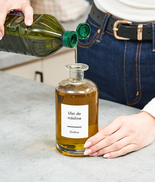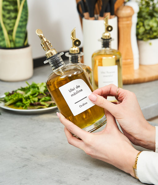 Sticlele elegante pentru ulei și oțet emană o estetică rafinată în orice bucătărie. Cu etichetele albe rezistente la apă, le poți organiza eficient și identifica mai rapid. Le ai mereu la îndemână, fără a mai pierde timp. Simplu, practic și elegant. Acest set devine partenerul perfect în bucătărie.