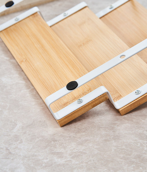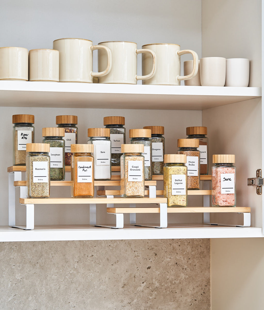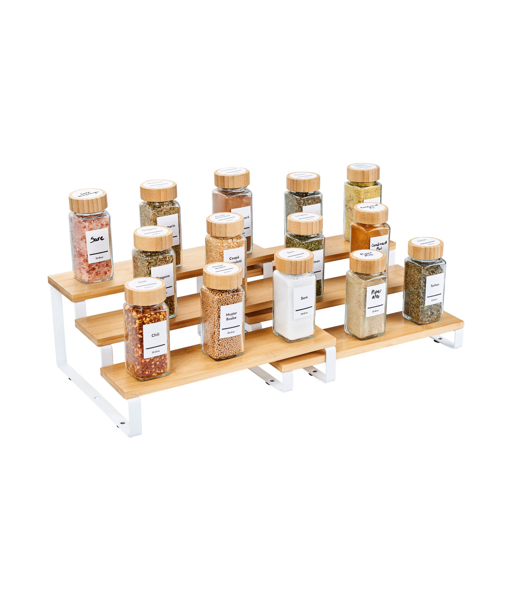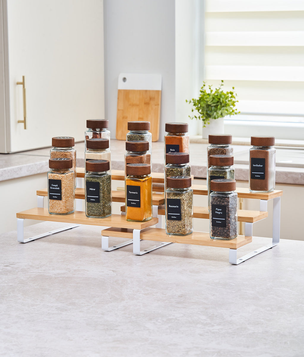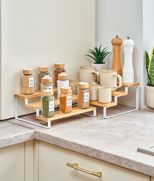 Suporturile îți oferă 3 nivele de depozitare, așa că poți vedea dintr-o privire ce ai nevoie. Condimentele sau cănile sunt perfect organizate și mereu la îndemână. Materialele sunt rezistente și durabile, dar în același timp elegante. Bambus lăcuit și metal vopsit fin, pentru un plus de stil.