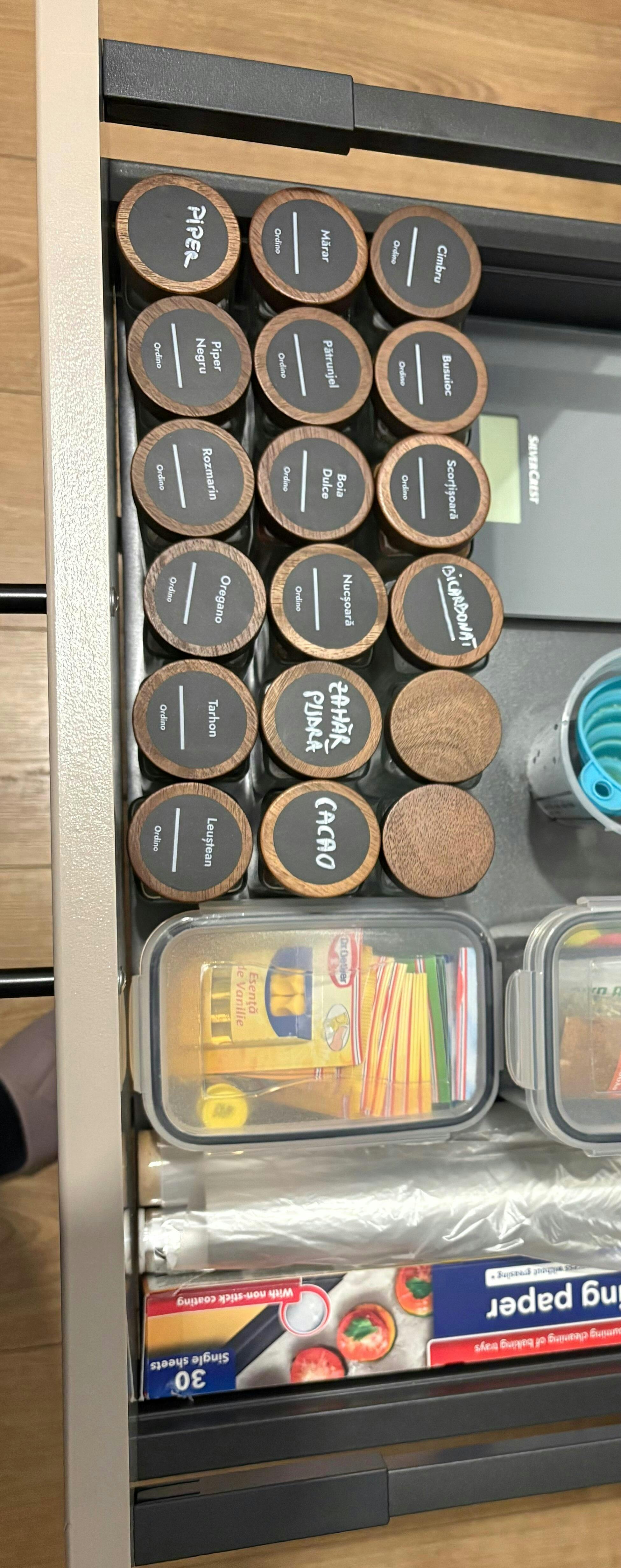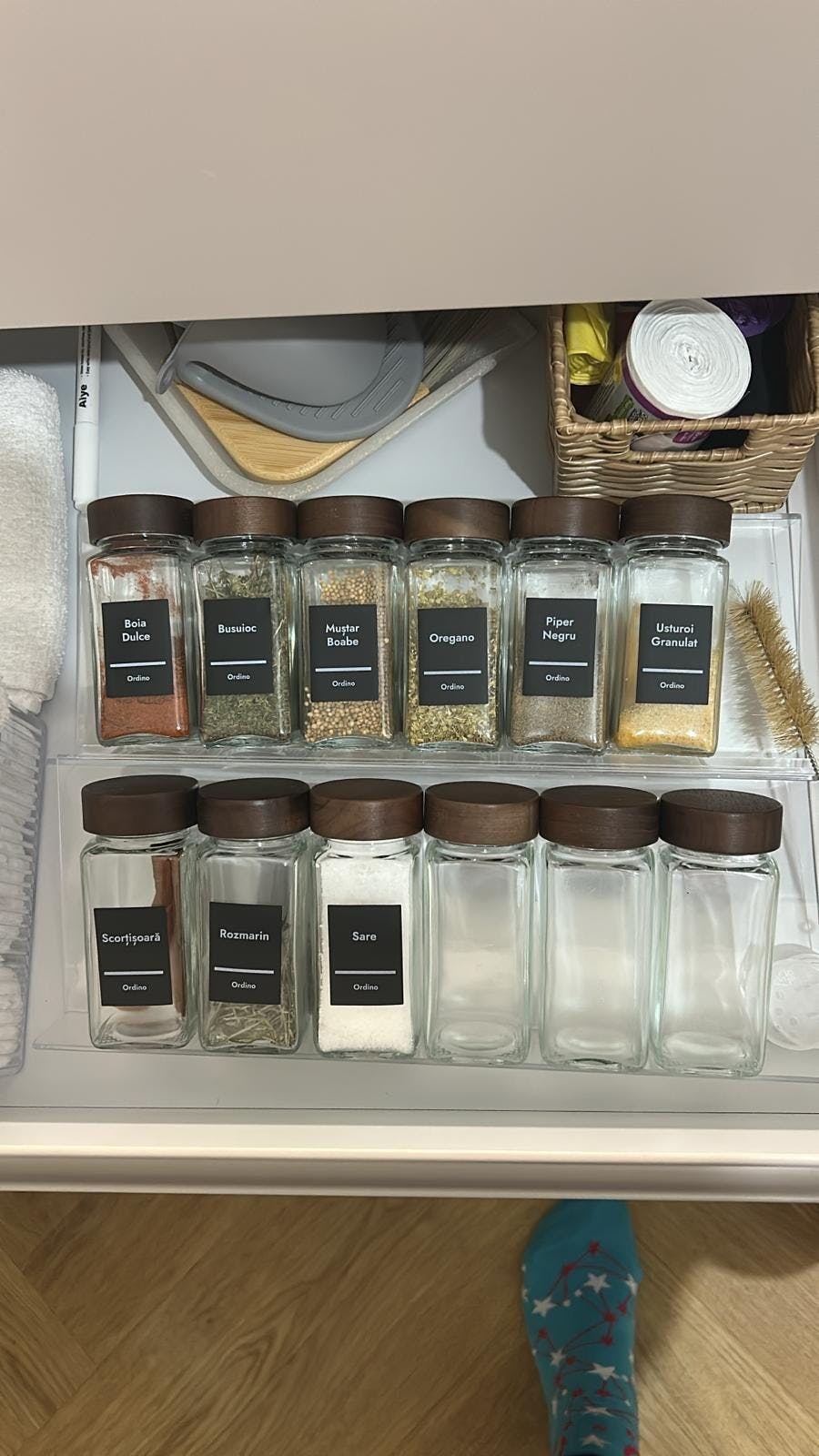 Sticla transparentă oferă vizibilitate clară asupra condimentelor. Nu mai pierzi timp în căutarea mirodeniilor aruncate haotic în dulap. Acum ai totul pregătit și la îndemână. Gătitul devine mai ușor și rapid. Organizarea eficientă te ajută să menții ordinea și să economisești timp prețios în bucătărie.