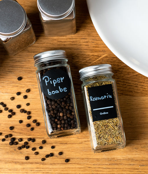 Le poți personaliza după bunul plac cu ajutorul unui marker alb inclus. În setul ales vei primi 48 de autocolante goale pe care le poți lipi cu ușurință pe sticluțe. Tu decizi ce, cum și unde scrii pe ele. În plus, primești și 48 de autocolante deja imprimate cu cele mai populare condimente.