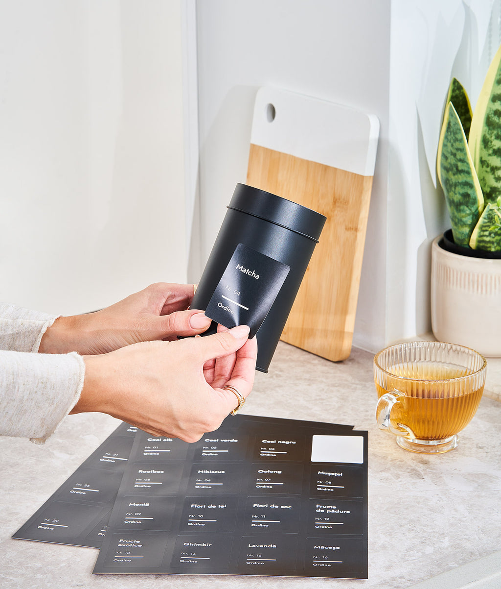 Ideale pentru a-ți organiza colecția de ceaiuri într-un mod estetic și coerent. Arată bine, se lipesc ușor, nu lasă urme și se potrivesc perfect pe orice recipient – fie el din sticlă, metal, plastic sau ceramică. O soluție simplă care aduce ordine, frumusețe și satisfacție în fiecare detaliu.