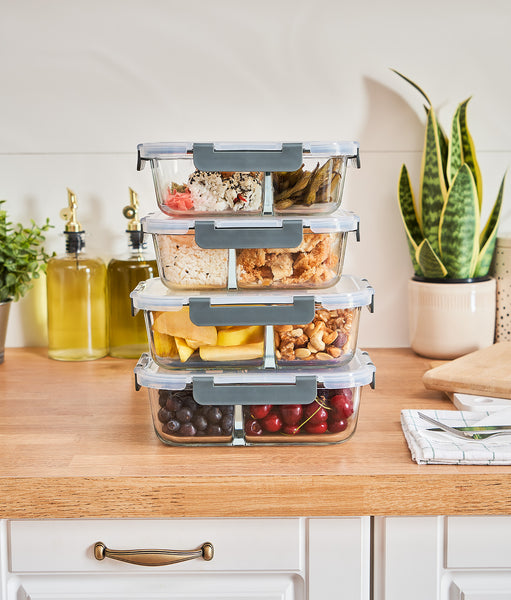Setul de 4 caserole compartimentate conține 2 caserole mari de 1020 ml și 2 extra-mari de 1460 ml. Sunt realizate dintr-o sticlă rezistentă, cu perete dublu. Le poți păstra în frigider, congelator, microunde și cuptor. Fiecare caserolă are un separator din sticlă, oferind 2 spații delimitate. Capacul e din plastic rezistent și are închidere etanșă.