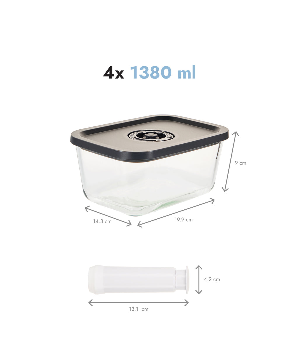 Set de 4 caserole din sticlă borosilicată cu perete dublu și capac cu supapă pentru vidare. Dimensiuni: 19.9 x 14.3 x 9 cm - 1380 ml. Etanșare cu garnitură din silicon. Pompă de vidare inclusă. Capacele sunt compatibile cu aparatul și pompa de vidat Ordino. Caserolele sunt sigure pentru congelator, cuptor, microunde și mașina de spălat vase. Design compact și stivuibil. Fără BPA. Indicator pe capac pentru data vidării. Capac ușor de deschis.