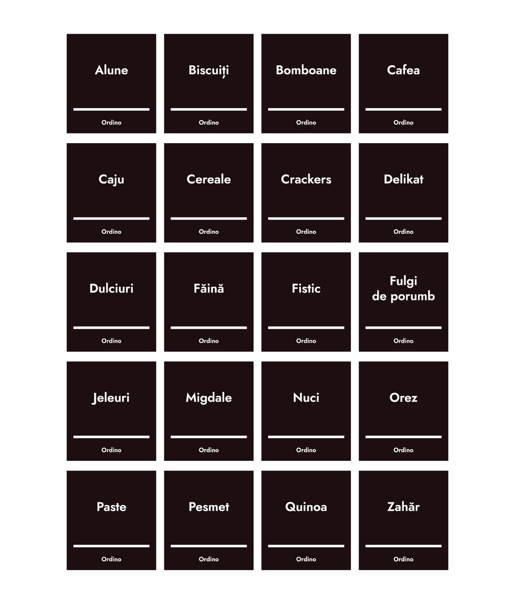 În acest set sunt 2 tipuri de etichete autocolante și un marker alb. Dintre care, unele imprimate în limba română și altele complet goale, pe care le poți personaliza cu ajutorul markerului inclus. Mai exact, primești: un marker alb, 20 de etichete goale – tu decizi ce scrii pe ele. În plus, ai 20 de etichete deja imprimate cu cele mai des întâlnite denumiri pentru alimente uscate.