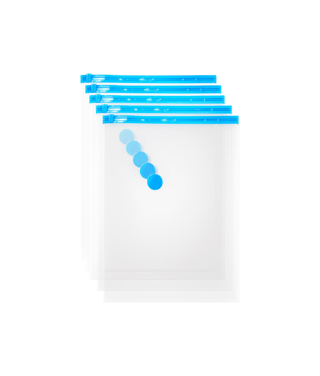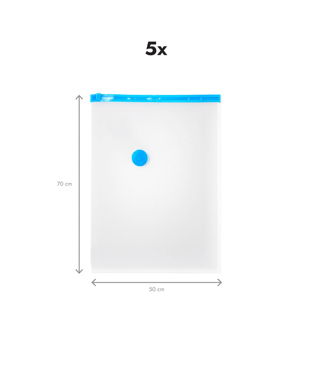Set cu 5 saci de vidat reutilizabili, dimensiune medie – 50 × 70 cm. Realizați din plastic gros, transparent, fără BPA. Fiecare sac e prevăzut cu valvă triplă pentru o vidare eficientă și fermoar dublu care asigură o etanșare completă. Pot fi folosiți cu pompă manuală (inclusă în set), cu aspirator sau cu pompă electrică. Au formă compactă și plată, ușor de depozitat sub pat, pe rafturi, în dulapuri sau în valiză.