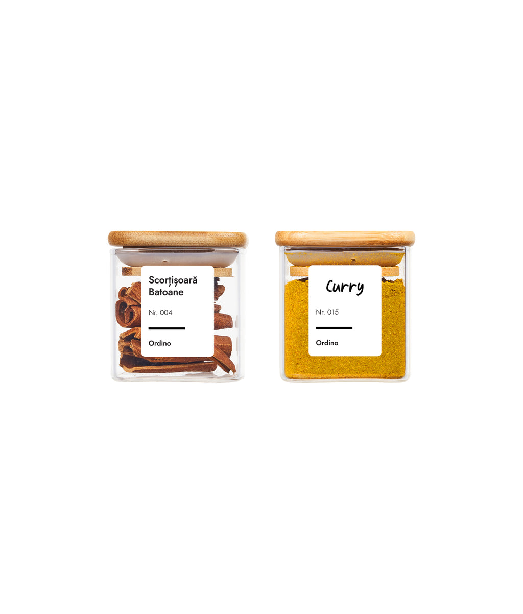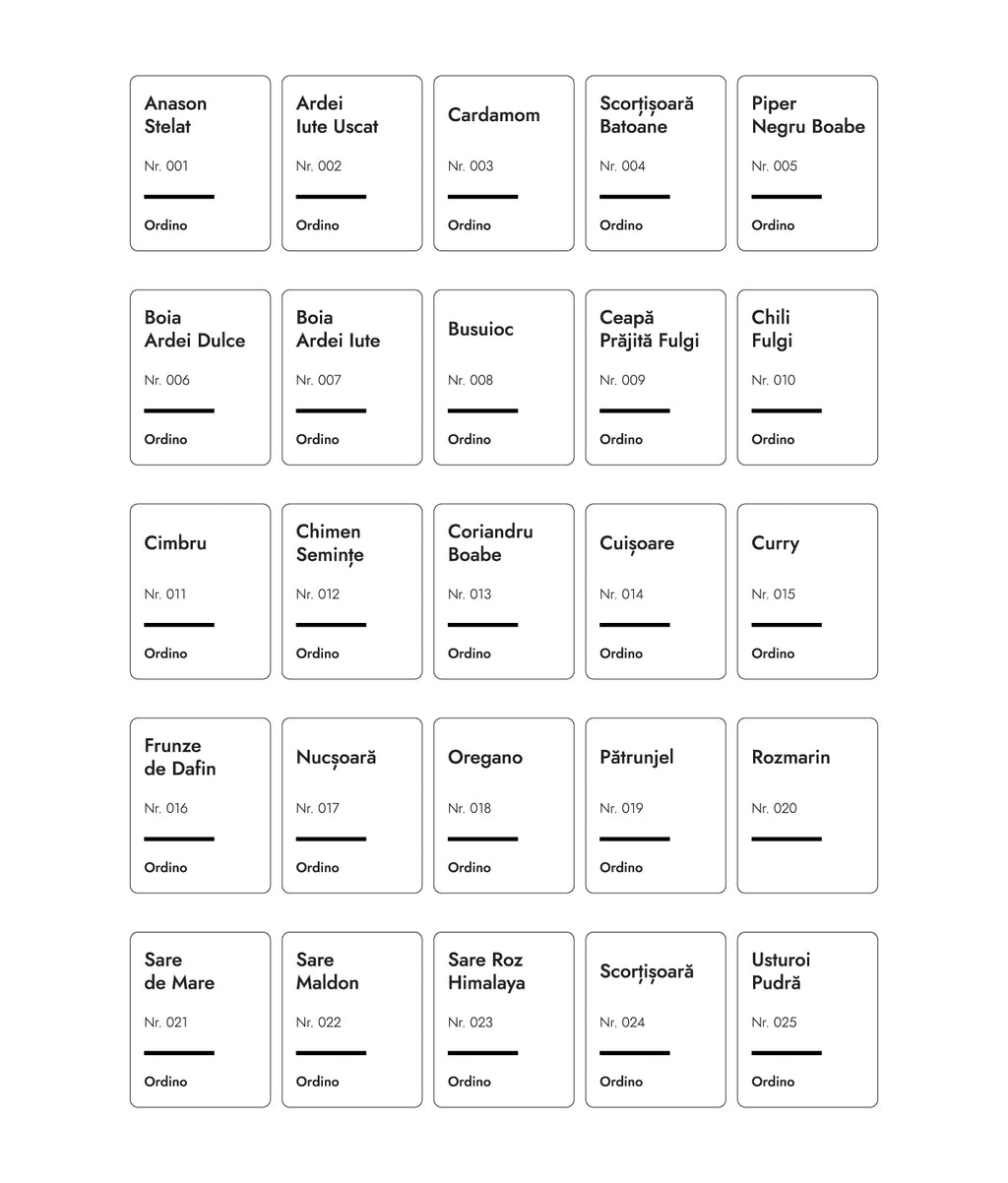 Setul de etichete autocolante albe include 25 de etichete imprimate în limba română cu cele mai utilizate condimente. Și 25 de etichete goale, pe care le poți personaliza cu markerul negru inclus. Iar materialul autocolant rezistent la apă asigură durabilitate și o aplicare ușoară.