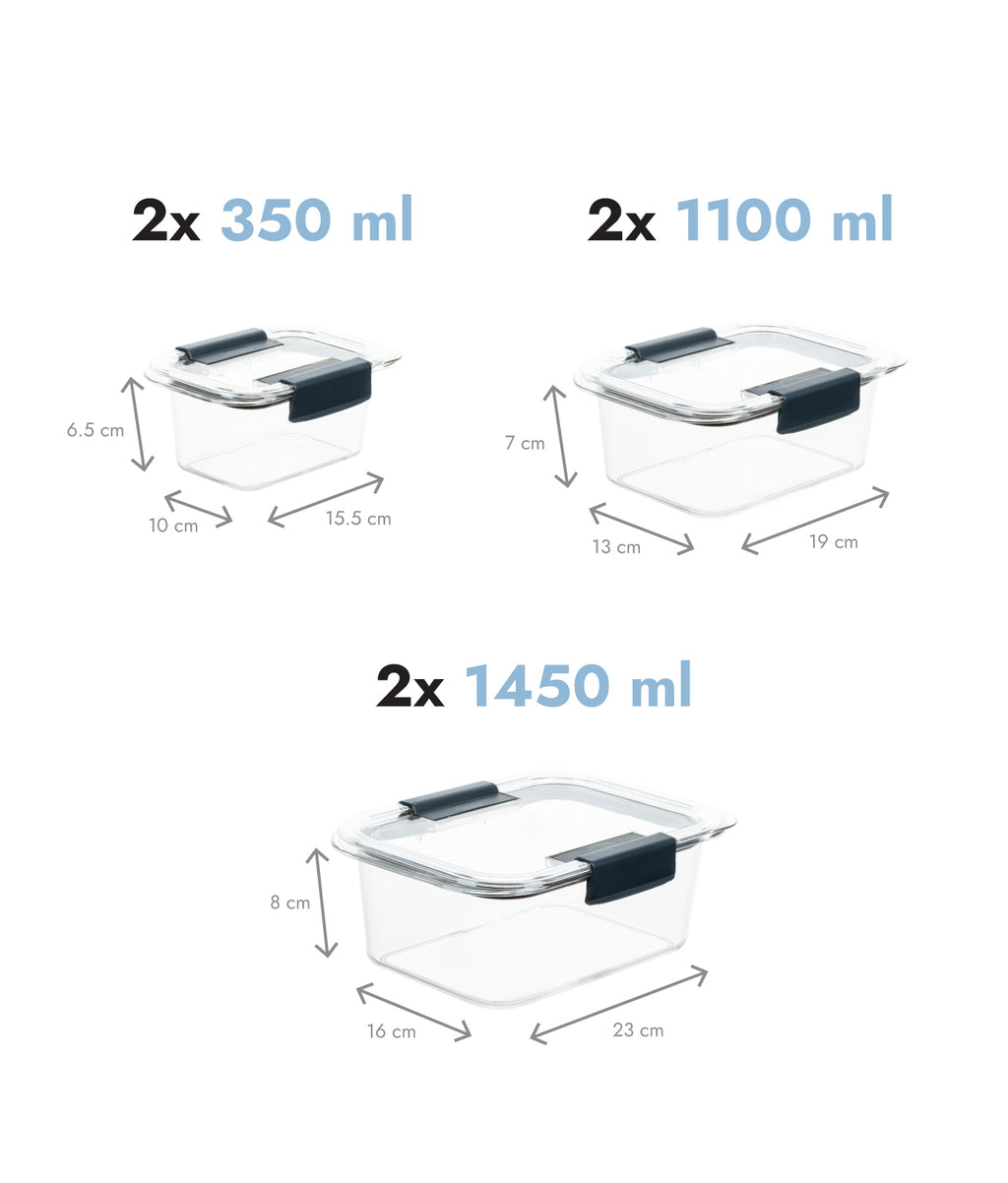 Setul conține 6 caserole transparente crystal-clear cu 3 dimensiuni diferite. Sunt realizate dintr-un material rezistent și calitativ. Se pot păstra în frigider și congelator. Iar mâncarea se poate încălzi chiar și în cuptorul cu microunde mulțumită sistemului de ventilație. Sunt ușor de spălat și de transportat. Nu sunt potrivite pentru mașina de spălat. Capacul are o închidere etanșă și vine cu o garnitură de silicon.