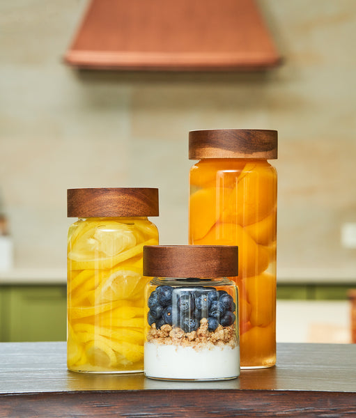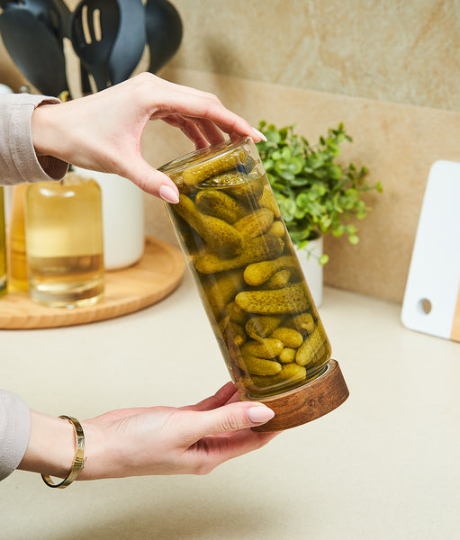 Ideale pentru depozitarea alimentelor din casă într-un mod mai elegant. Recipientele din sticlă asigură prospețime și siguranță pe o perioadă mai lungă de timp. Capacul cu închidere etanșă sigilează perfect conținutul, iar materialul din lemn acacia aduce un aer estetic în bucătărie. Sunt ușor de spălat și construite să dureze.