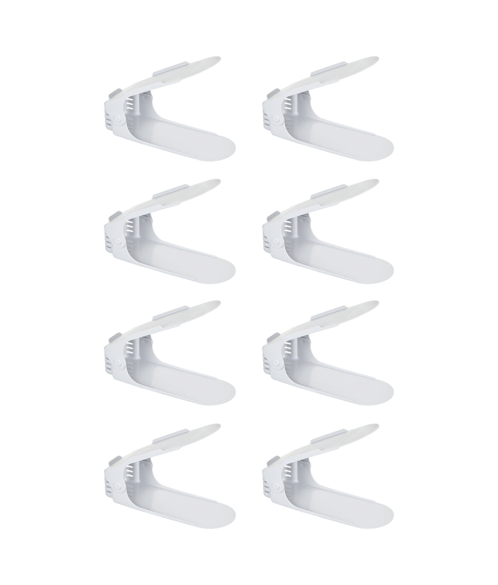 Set de 8 suporturi pantofi, dimensiuni 25.5 x 6 x 8-18 cm. Fabricat din plastic fără BPA, cu design simplu și estetic, finisaj mat și culoare neutră (gri deschis). Reglabil pe înălțime până la 18 cm, ideal pentru 80% din modelele de pantofi. Fiecare suport vine gata asamblat și poate fi poziționat direct în dulap sau pe raft. Include finisaj anti-alunecare cu puncte în relief și margine de 1 cm pentru stabilitate.