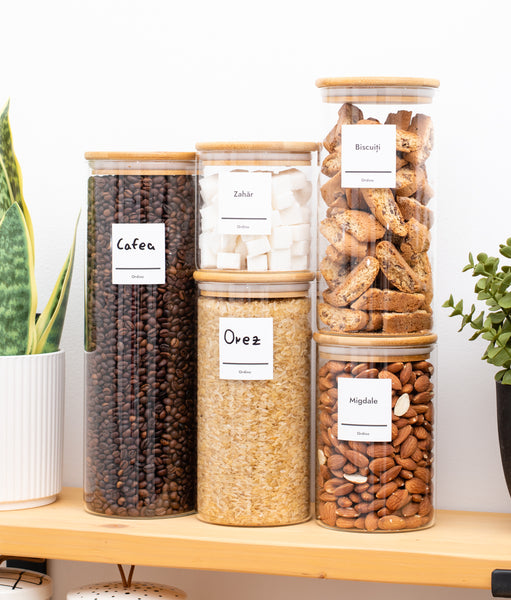 Recipientele etanșe din sticlă sunt esențiale și necesare pentru orice bucătărie. Cele 8 recipiente transparente au 4 dimensiuni diferite și au o formă cilindrică estetică. Primești 2 tipuri de autocolante rezistente la apă. Dintre care unul imprimat în limba română și unul gol, pe care-l poți personaliza cu ajutorul markerului inclus. Fiecare recipient are un capac etanș din bambus, care se fixează bine și ușor.