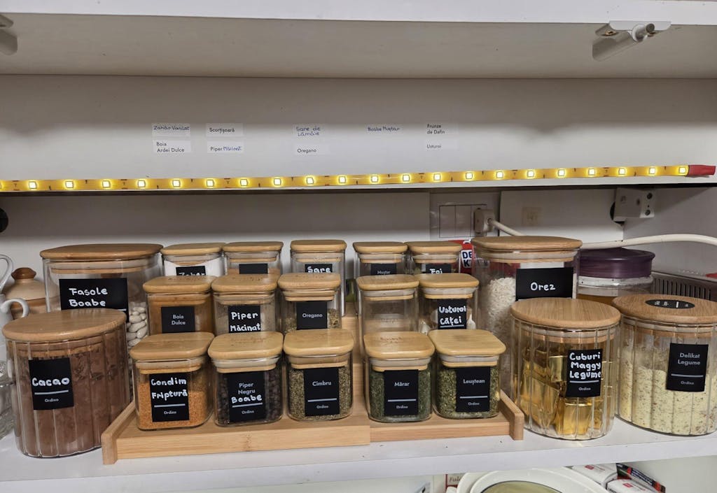 În acest set sunt 4 tipuri de etichete autocolante. Dintre care, 2 imprimate în limba română și 2 goale, pe care le poți personaliza. Mai exact primești: 48 de etichete goale; la care tu decizi ce, cum și unde scrii pe ele. În plus, primești și 48 de etichete deja imprimate cu cele mai populare condimente.