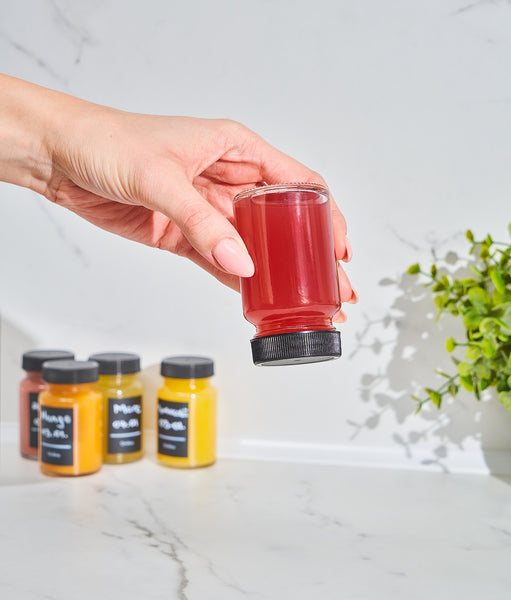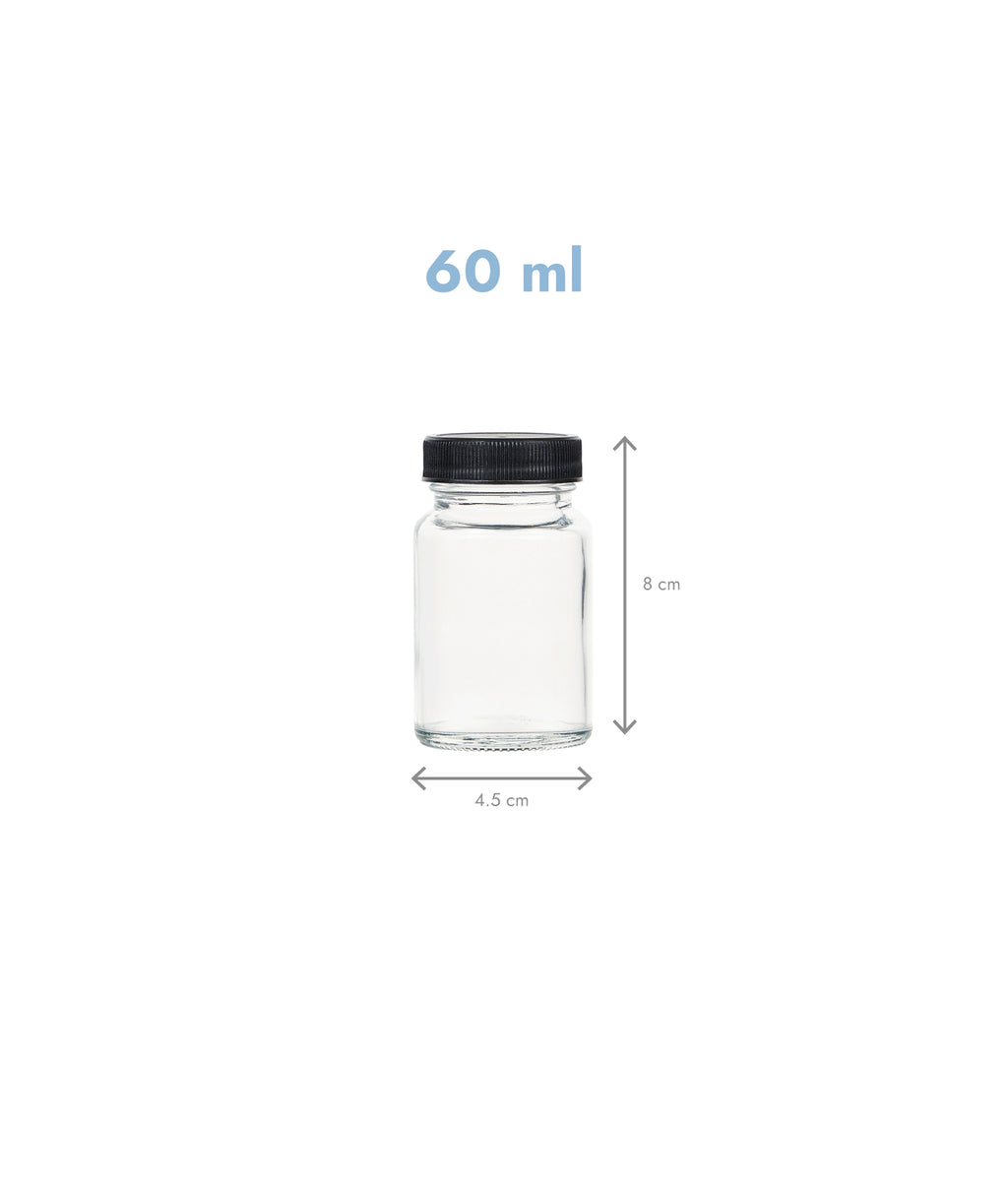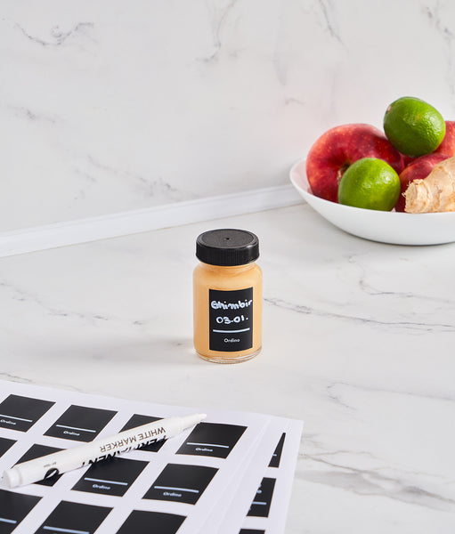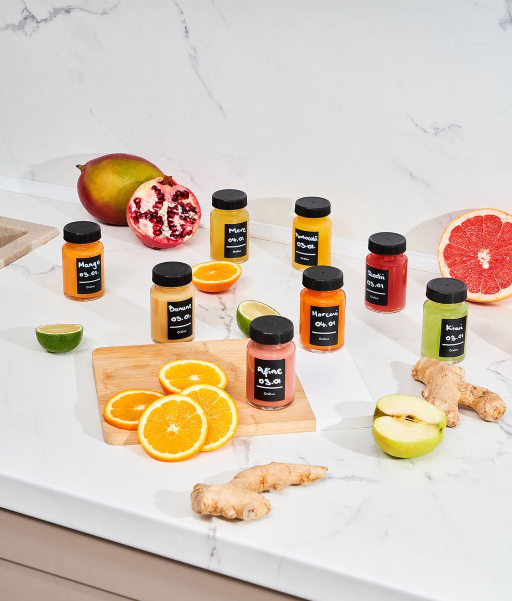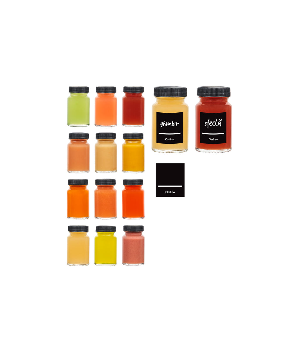 Cu 60 ml per sticlă, ai porția ideală pentru fiecare zi. Iar cu etichetele negre incluse și markerul alb, scrii data, rețeta sau beneficiul shot-ului. Totul devine simplu, organizat și estetic. Fără confuzii, fără amestecuri.