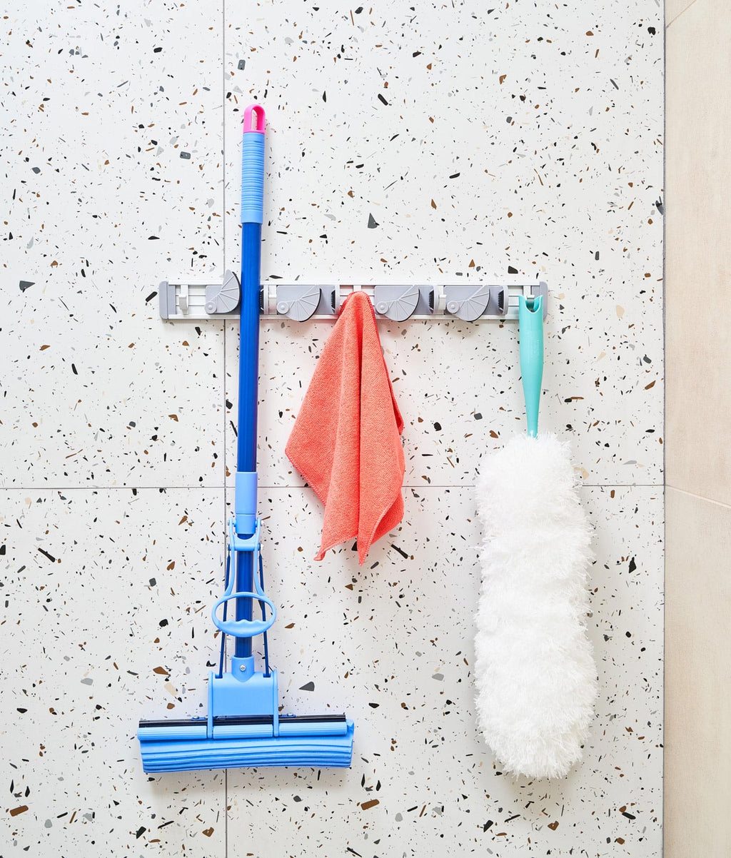 Pe lângă cleme, bara are 4 cârlige culisante. Acolo poți agăța lavete, perii, mănuși sau bureți. Așa, nu le mai lași împrăștiate prin casă. Toate accesoriile de curățenie stau adunate la un loc, iar spațiul rămâne liber și ordonat.