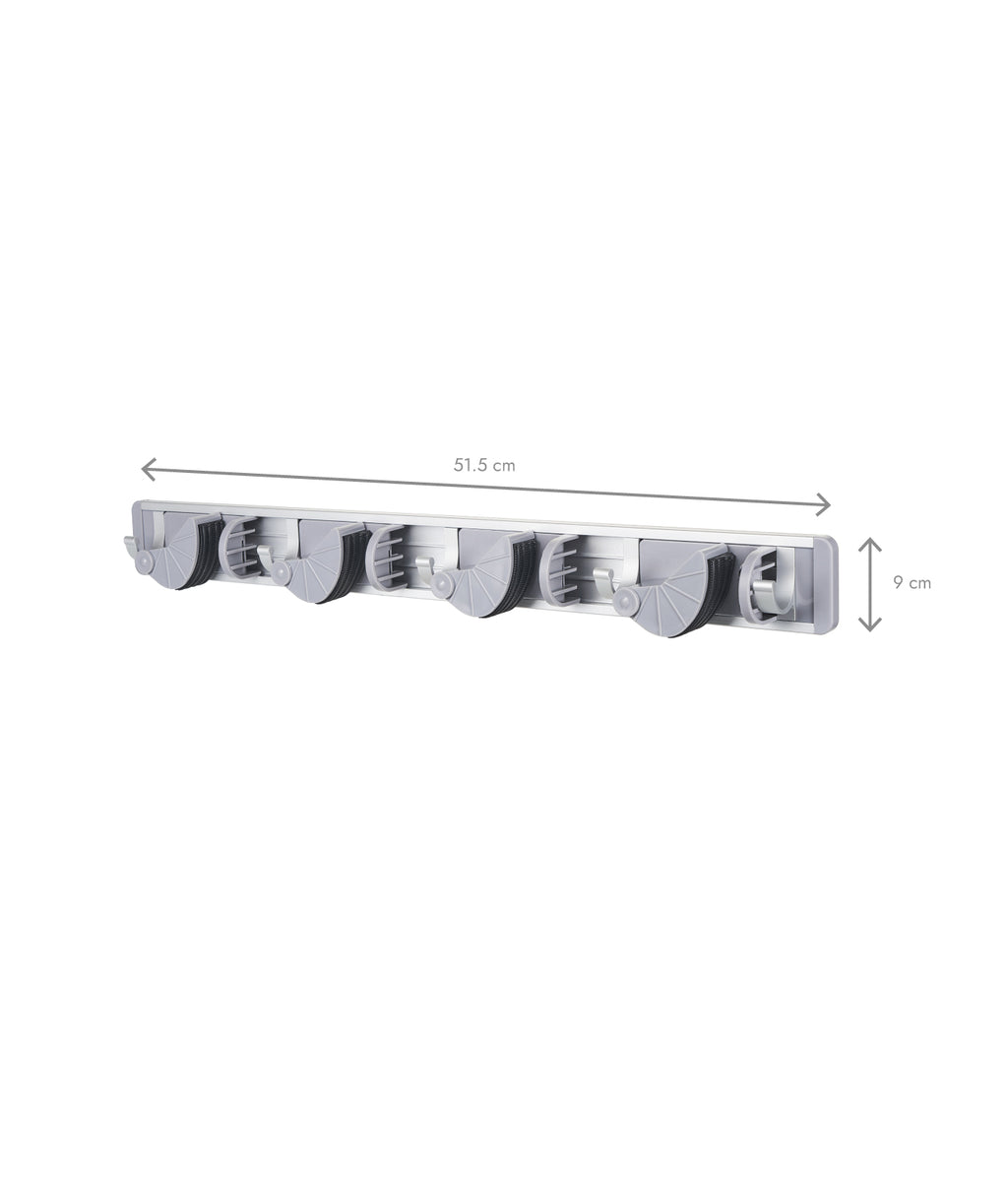 Suportul are o lungime de 51.5 cm și e realizat din metal și plastic dur. Include 4 cleme ajustabile, compatibile cu cozi între 1.5 și 3.3 cm, care prind ferm uneltele prin sistem de presare și material antiderapant. Suportă până la 20 kg în total (maxim 4 kg per obiect). Bara extinsă are cârlige culisante pentru accesorii. Iar kitul de instalare cu șuruburi e inclus.