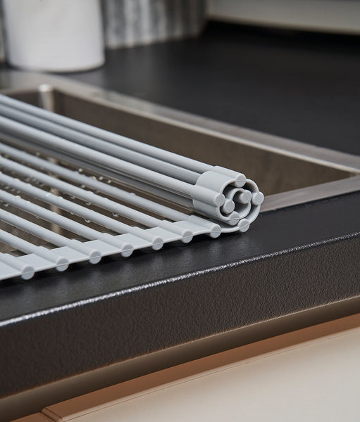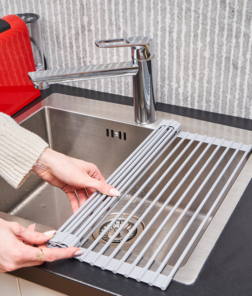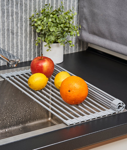 Suportul multifuncțional pentru chiuvetă e disponibil în 2 dimensiuni: mediu și mare. E fabricat din oțel inoxidabil și acoperit complet cu un silicon gri deschis. Aceasta e rezistent termic până la 204°C și e potrivit pentru mașina de spălat vase. Poate fi rulat pentru o depozitare comodă și e rezistentă la greutate.