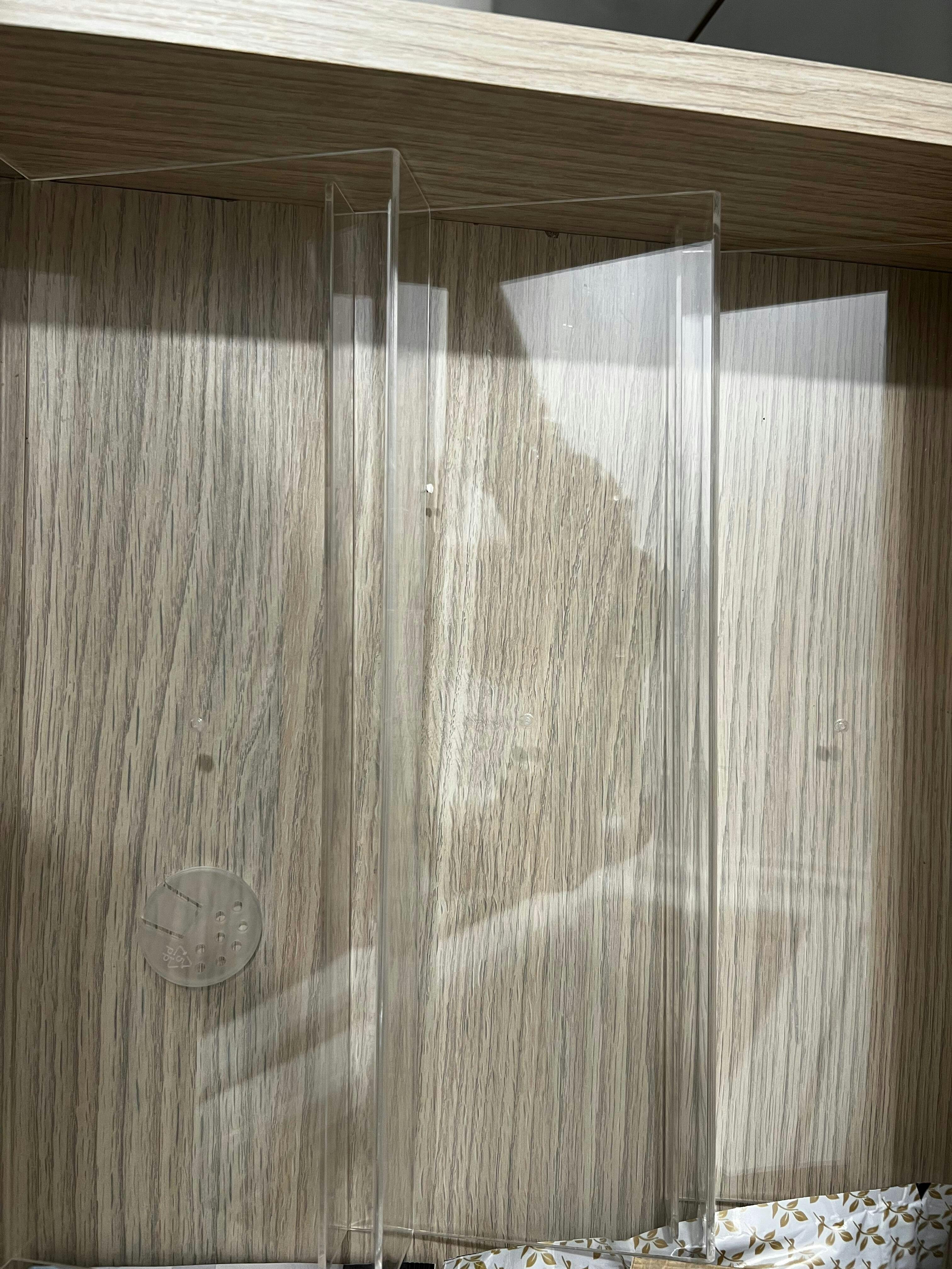 Suportul de sertar pentru sticluțe de condimente are dimensiunile 33.5 x 43 x 4.5 cm și e compus din 4 secțiuni suprapuse. Dispune de 3 compartimente mari și unul mic, cu dimensiunile 33.5 x 11.5 x 4.5 cm, respectiv 33.5 x 5 x 4.5 cm. E realizat din plastic transparent și se potrivește perfect în dimensiunile sertarului.