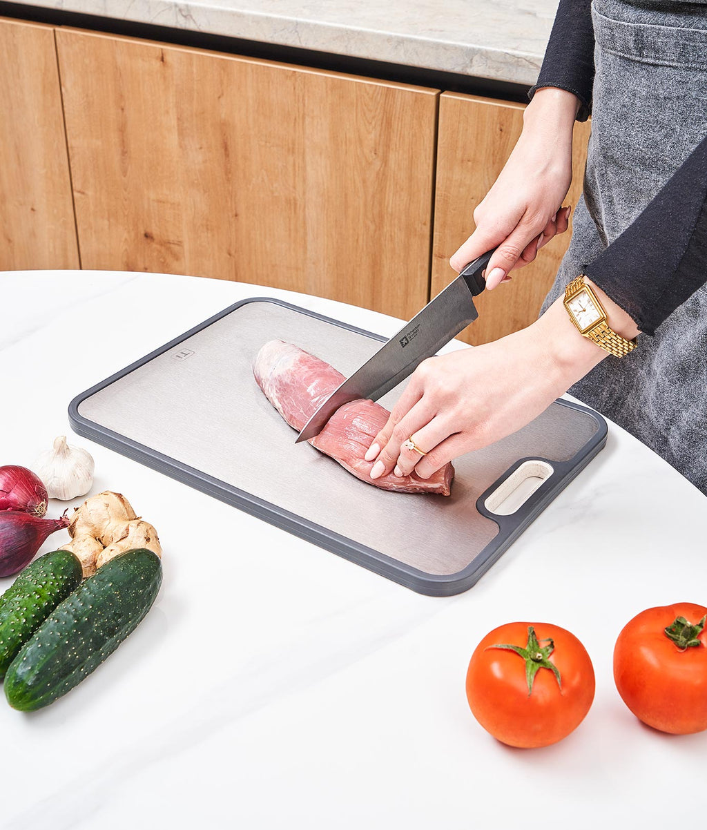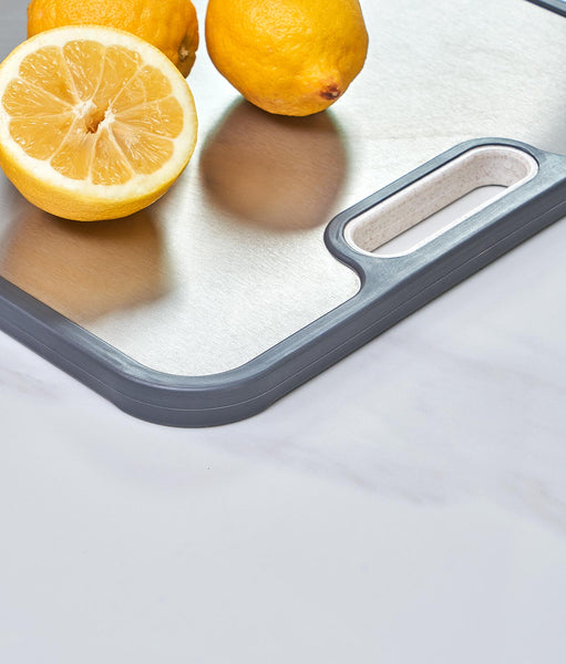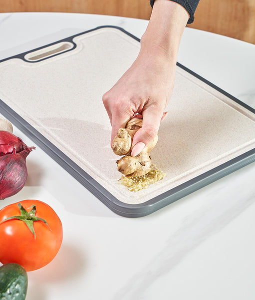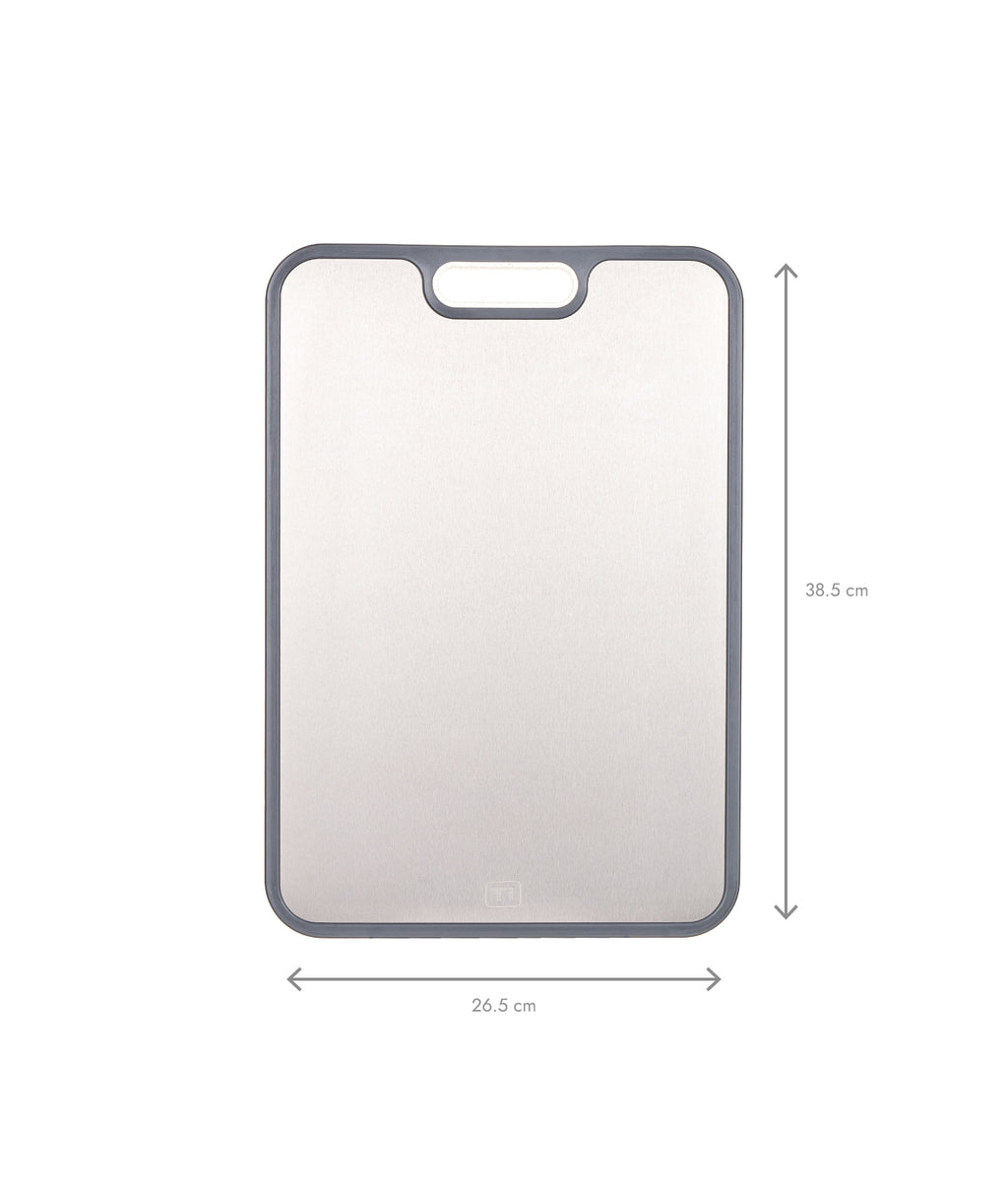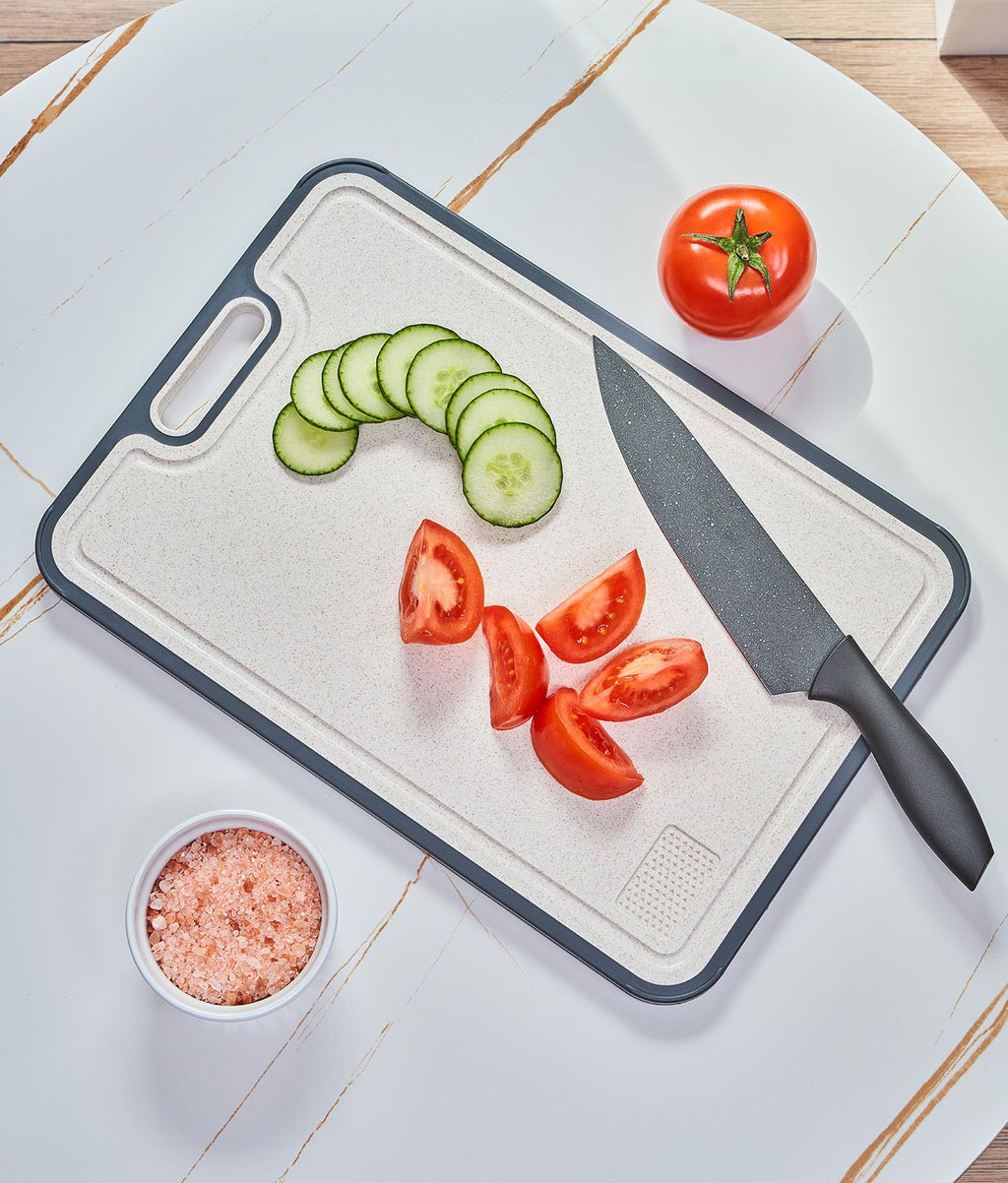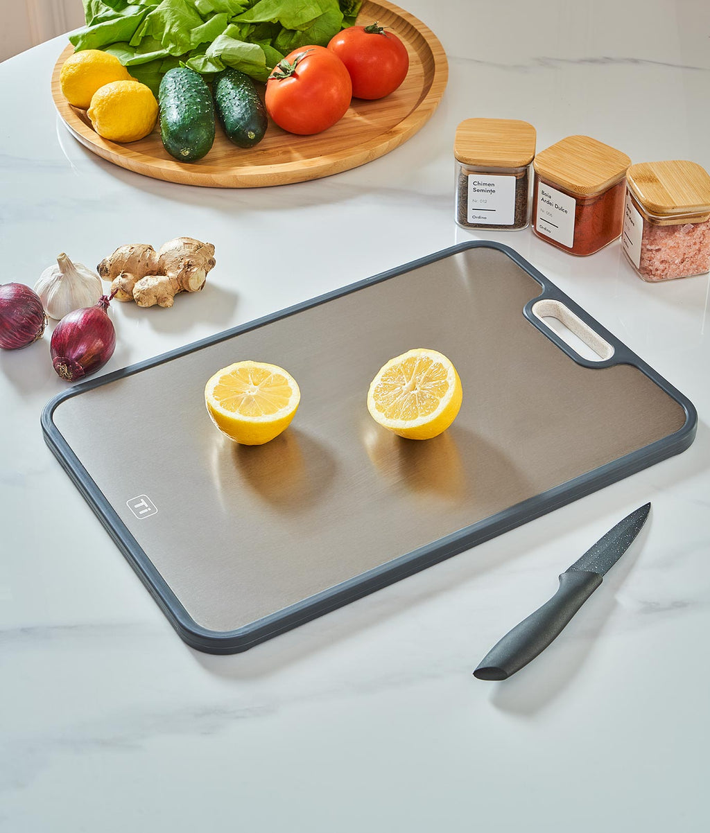 Tocător cu dimensiunile 38.5 x 26.5 x 1.4 cm. Fabricat din două materiale: o față din titan și una din fibre de paie de grâu. Fața din titan e recomandată pentru tăierea cărnii crude sau gătite. Iar cea din paie de grâu e ideală pentru legume și fructe. Include mâner lateral pentru transport ușor, canal pentru colectarea lichidelor, contur din silicon antiderapant și răzălitor încorporat. Suprafață rezistentă la căldură. Compatibil cu mașina de spălat vase. Nu absoarbe lichide sau mirosuri.