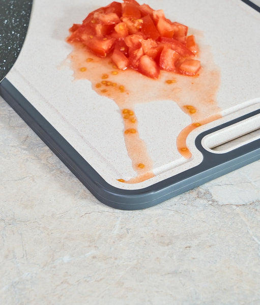 Designul inteligent cu șanț de colectare oprește lichidul să se scurgă pe blat. Totul rămâne curat și organizat, indiferent ce fel de alimente tai.