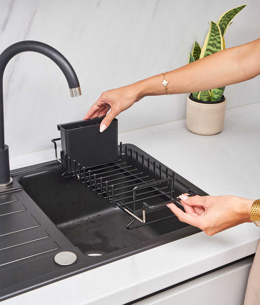 Uscătorul de vase compact 3 în 1 poate fi folosit în trei moduri diferite: așezat în chiuvetă, pe chiuvetă sau lângă chiuvetă. Uscătorul măsoară între 35-50 cm în lungime, are 16 cm lățime și o înălțime de 16,5 cm. E suficient de încăpător pentru tacâmuri și până la 10 farfurii. E fabricat din materiale rezistente precum oțel-carbon și oțel inoxidabil. Vine într-o culoare elegantă, neagră. Datorită stratului anti-rugină, uscătorul e durabil și ușor de întreținut.