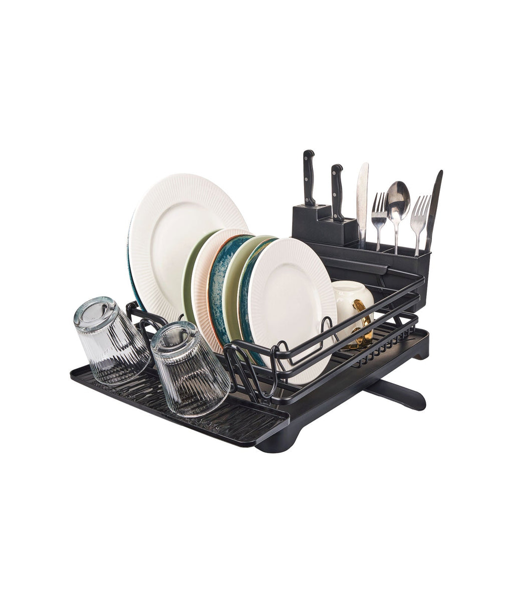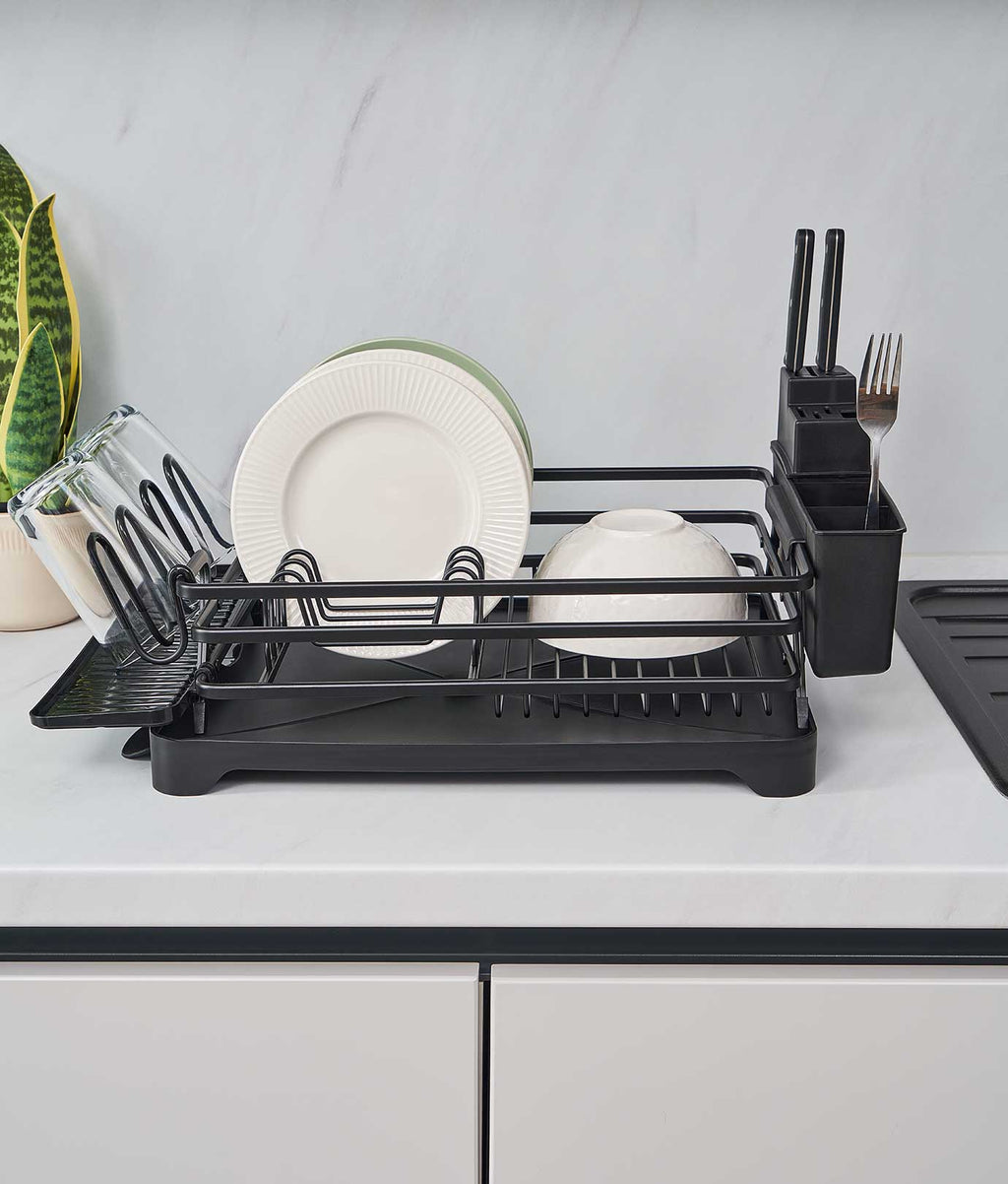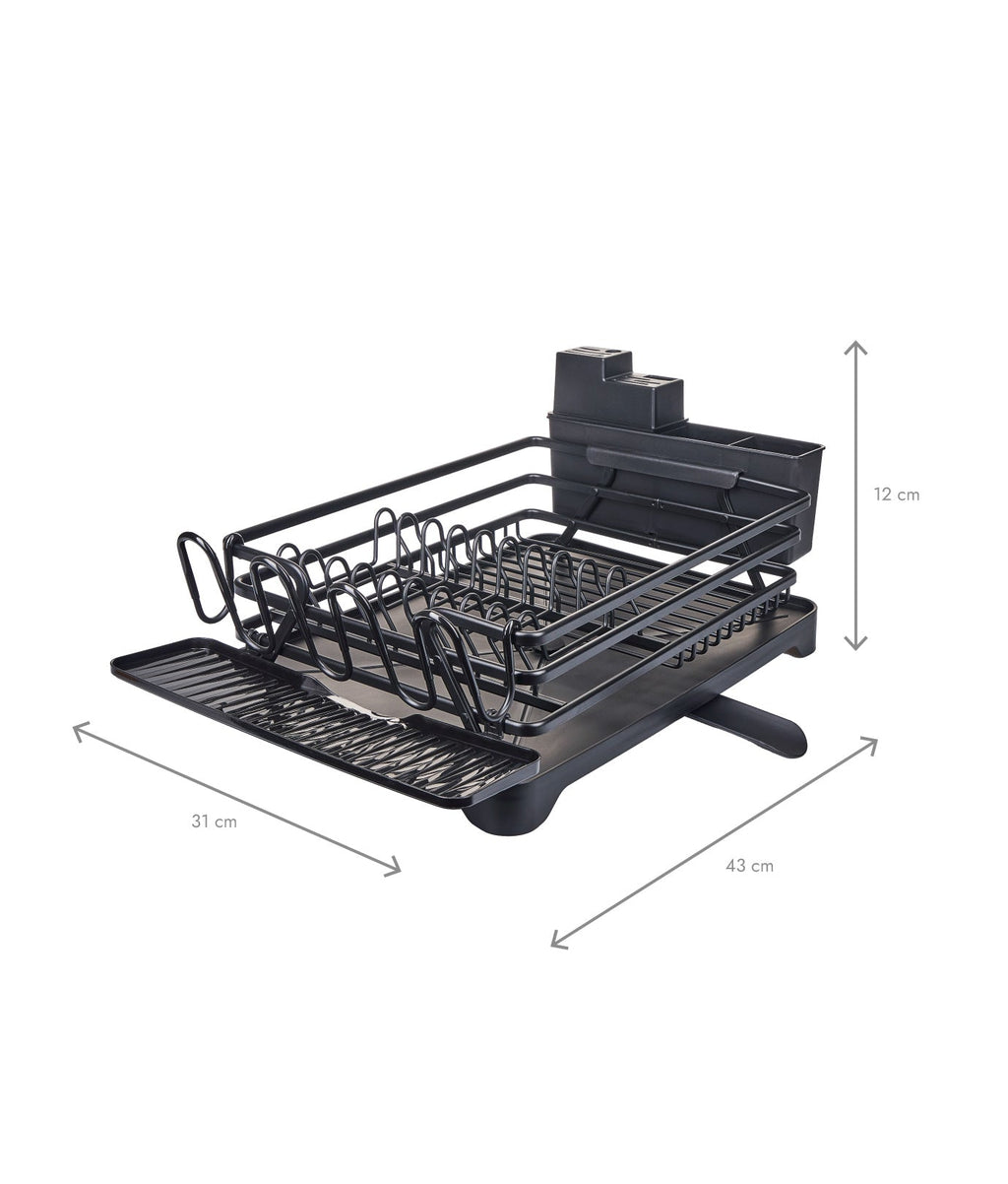 Uscătorul de vase multifuncțional are dimensiuni compacte de 43 x 31 x 12 cm. Materialul din aluminiu, cu strat anti-rugină, îi asigură durabilitatea. În plus, culoarea neagră adaugă eleganță în bucătărie. Are suporturi dedicate pentru cuțite, pahare și tacâmuri, împreună cu o tavă de scurgere cu canal ajustabil.