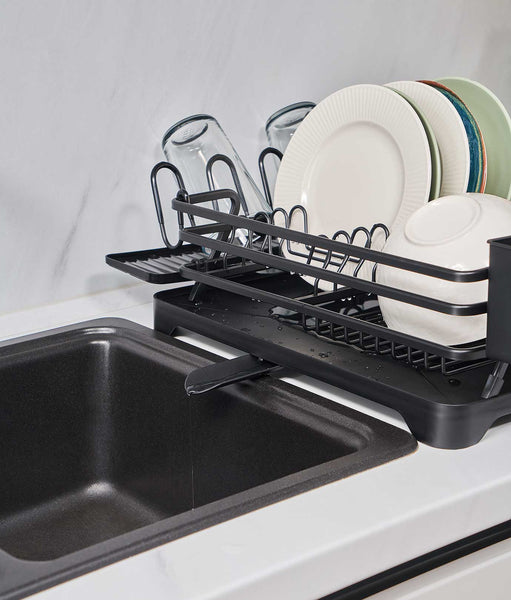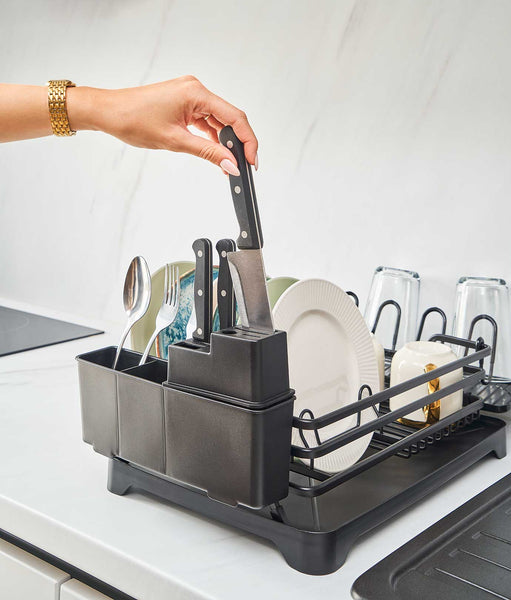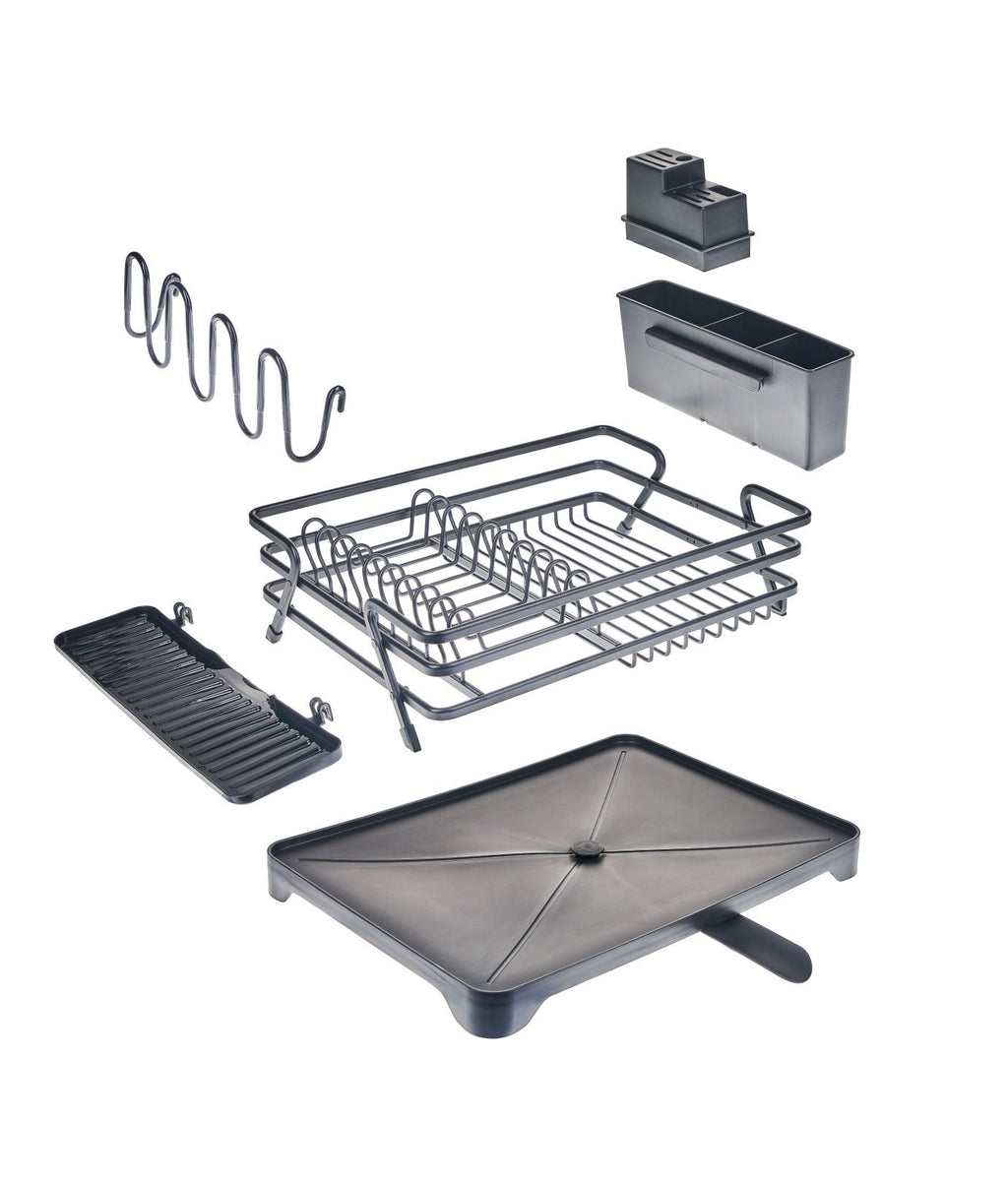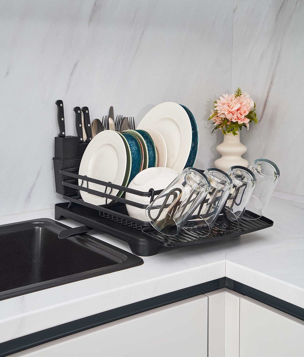 Uscătorul de vase multifuncțional are dimensiuni compacte de 43 x 31 x 12 cm. Materialul din aluminiu, cu strat anti-rugină, îi asigură durabilitatea. În plus, culoarea neagră adaugă eleganță în bucătărie. Are suporturi dedicate pentru cuțite, pahare și tacâmuri, împreună cu o tavă de scurgere cu canal ajustabil.