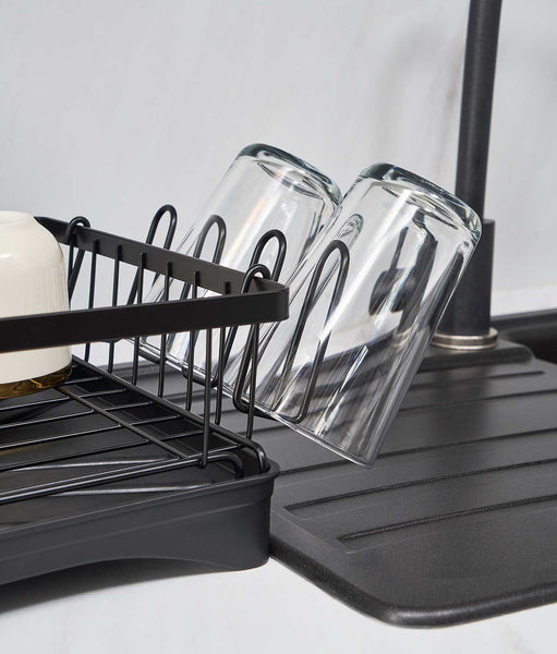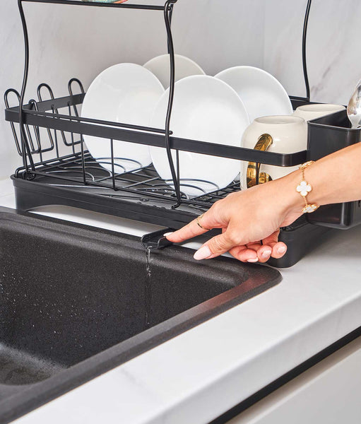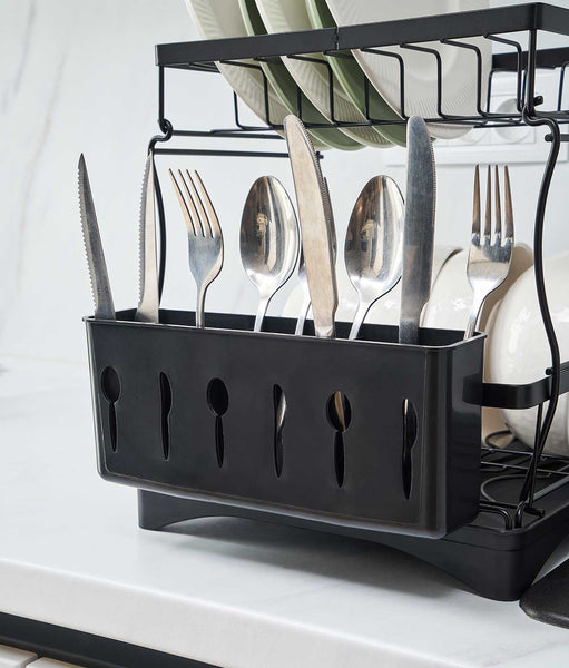 Uscătorul de vase multifuncțional, semi-etajat are dimensiuni de 49 x 30 x 34 cm și culoarea elegantă negru. E fabricat din oțel durabil și acoperit cu un strat protector. Dispune de un canal de scurgere ajustabil, ce poate fi extins și rotit pentru a direcționa apa în chiuvetă. Are suport pentru tacâmuri, suport pentru pahare și o tăviță de picurare, care mențin blatul curat și ordonat.